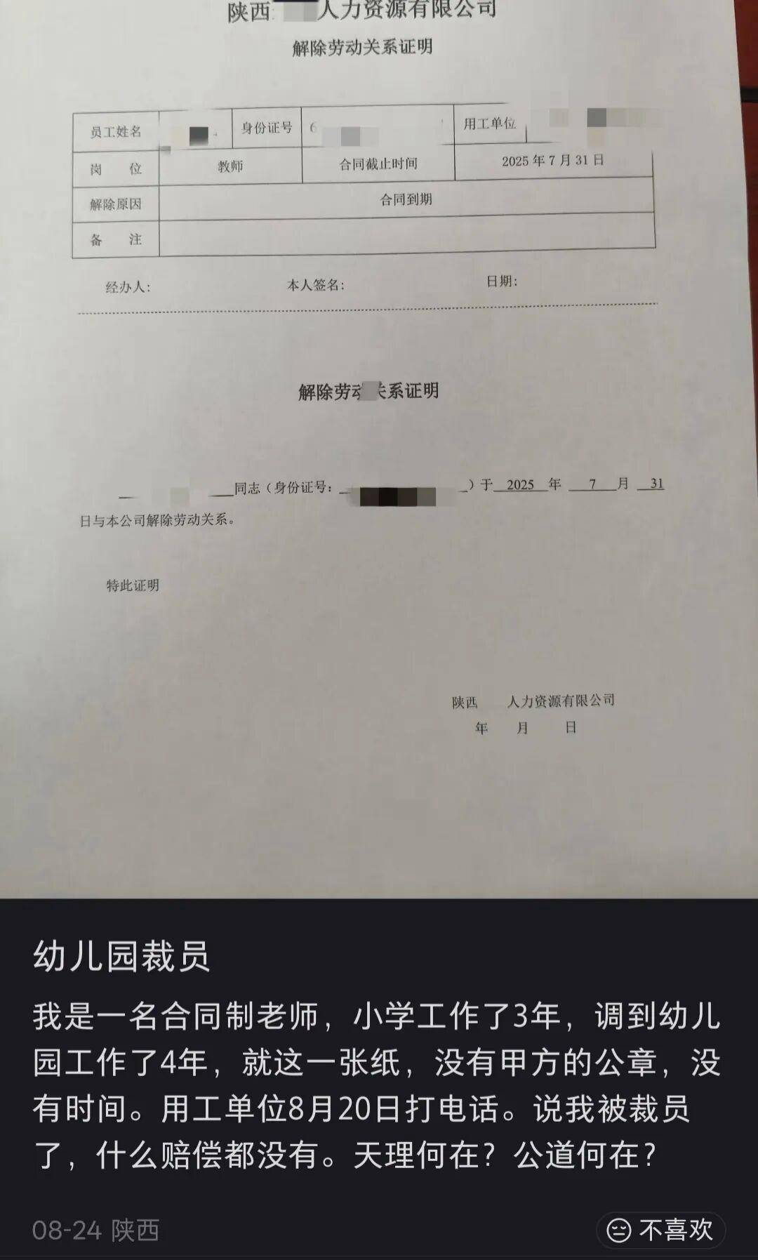 也有陕西某公办园幼师反映,自己接到人力资源公司的裁员通知。