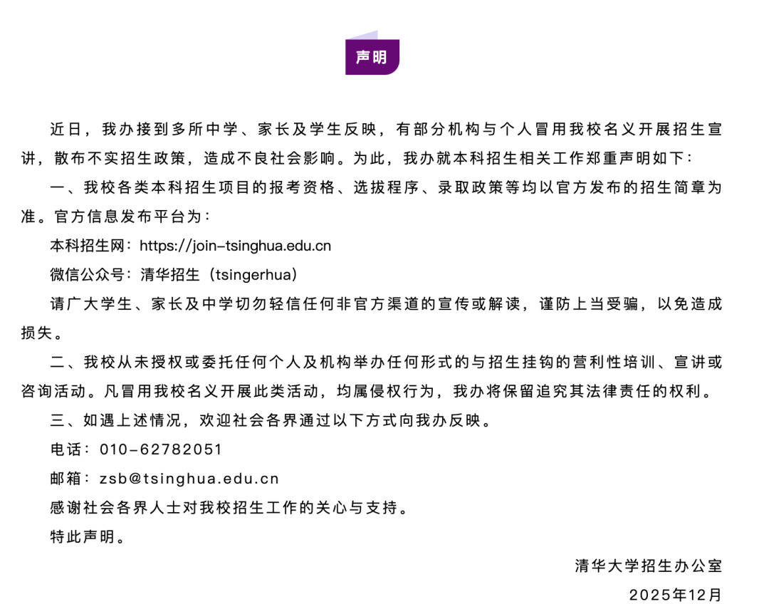 声明称,近日,清华大学招生办接到多所中学、家长及学生反映,有部分机构与个人冒用清华大学名义开展招生宣讲,散布不实招生政策,造成不良社会影响。