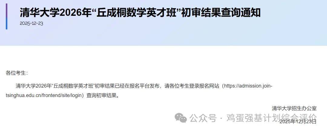清华数学英才班初审结果公布