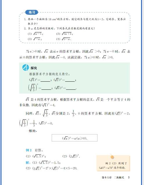 - 对比性质 \((\sqrt{a})^2\) 和 \(\sqrt{a^2}\) 的区别:如 \(a=-2\) 时,\((\sqrt{2})^2=2\),\(\sqrt{(-2)^2}=\sqrt{4}=2=|-2|\),初步感知绝对值的作用。