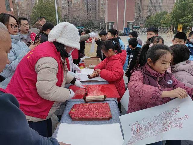 在“木版年画拓印”体验区,在博物馆工作人员的指导下,同学们亲手操作,将宣纸覆于木版之上,用拓包蘸墨均匀拍打,一幅幅寓意吉祥的年画便跃然纸上。孩子们在体验传统技艺魅力的同时,也深刻感受到了中华优秀传统文化的博大精深,民族自豪感油然而生。