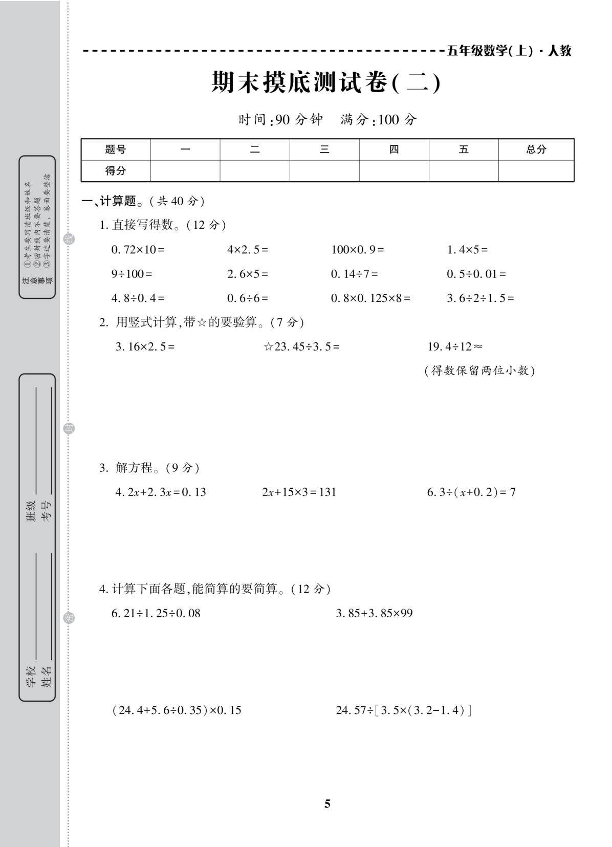 对学生学习而言,这份试卷的帮助体现在三方面:实现了知识点的全面覆盖,能帮学生排查小数运算、方程、图形面积等板块的薄弱点,明确期末复习的核心方向;多套试卷(摸底卷、质量检测卷、名校真题卷)的梯度设计,让学生可从基础巩固逐步过渡到能力拓展,熟悉不同难度的命题形式,提升应试适应力;最后,实际应用类题目能引导学生用数学思维解决生活问题,强化知识的应用能力,同时巩固小数运算、方程求解等核心技能。