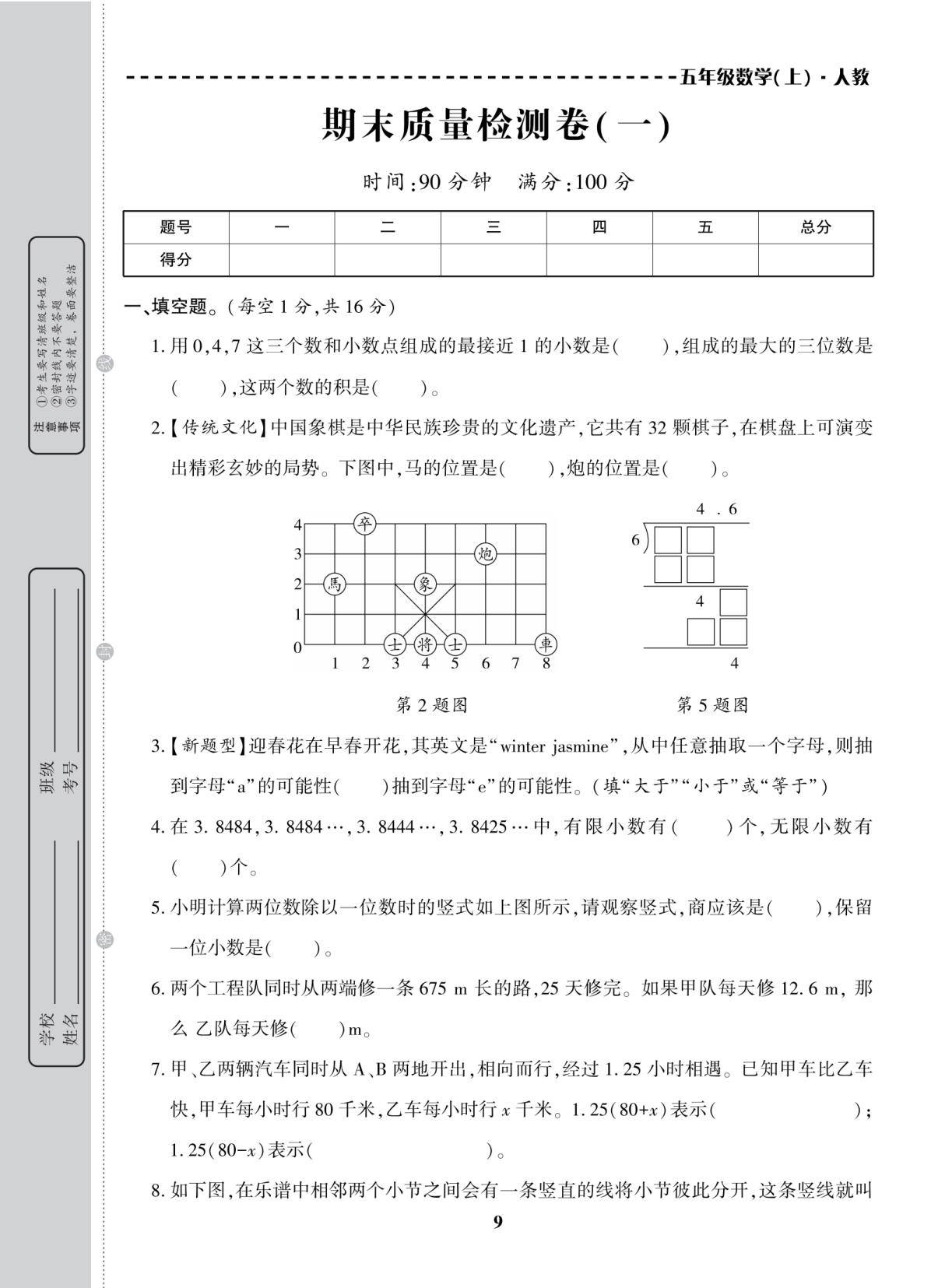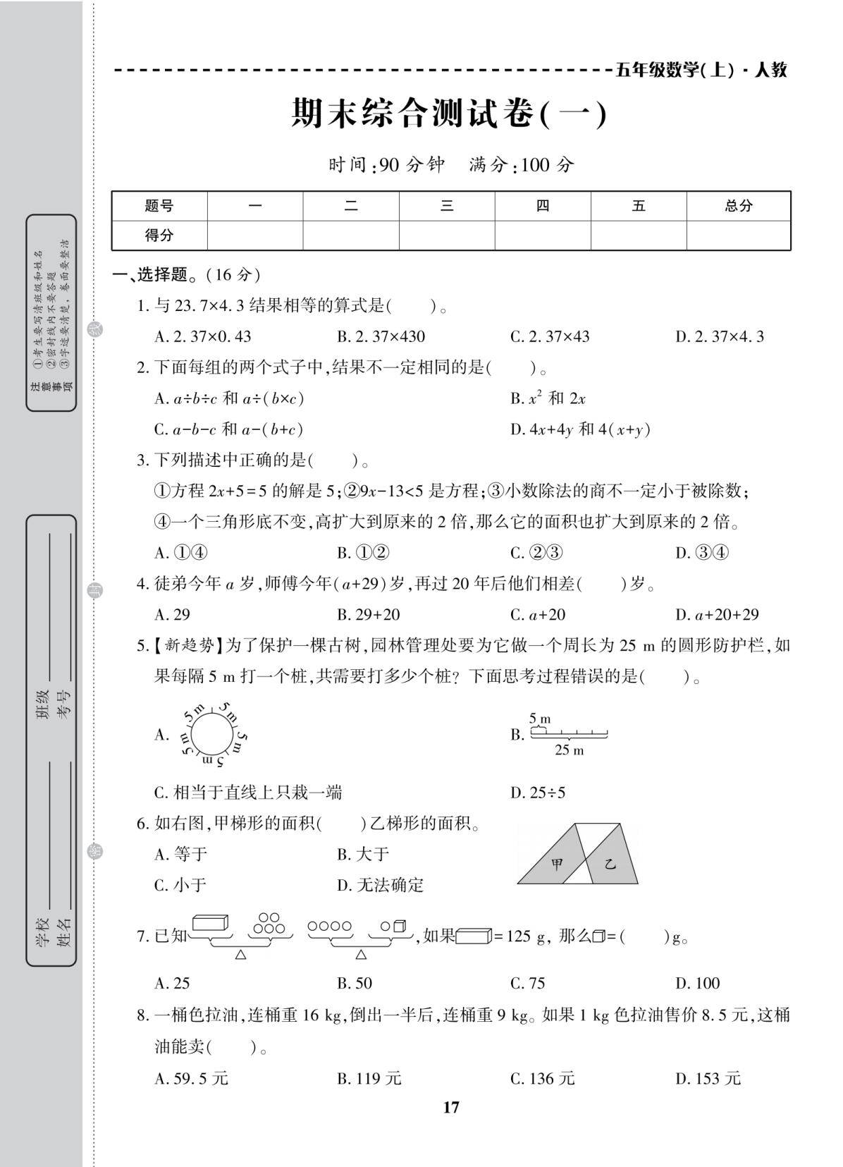 2025秋五年级上册数学期末试卷(共 10 套),是匹配人教版教材的期末检测资料,覆盖了该学段数学的核心知识点,是期末复习阶段巩固知识、熟悉考试形式的实用工具。从内容来看,试卷聚焦五年级上册数学的核心板块:数的运算,包含小数乘除法的口算、竖式计算、简便运算,这是该学段的计算基础;代数初步,涉及方程的求解、用字母表示数及数量关系(如年龄问题、工程问题的表达式);图形与几何,包含三角形、梯形面积比较,圆形防护栏的实际应用(封闭图形的植树问题);统计与概率,涉及可能性大小的比较;同时还有实际应用类题目(如油桶称重、工程队修路),侧重知识的生活迁移。