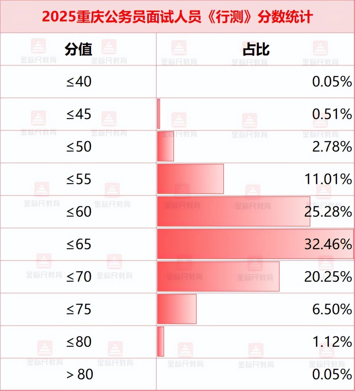 通过统计收集到的2025重庆公务员《行测》进面数据,我们可以看到2025重庆公务员进面人员《行测》分值分布范围为30-80分,其中以低分(30分)和高分(80分)进面的情况占比很小;大多数进面人员分数分在60-65分;能上70分已经算高分了,具体可以参考下图统计↓