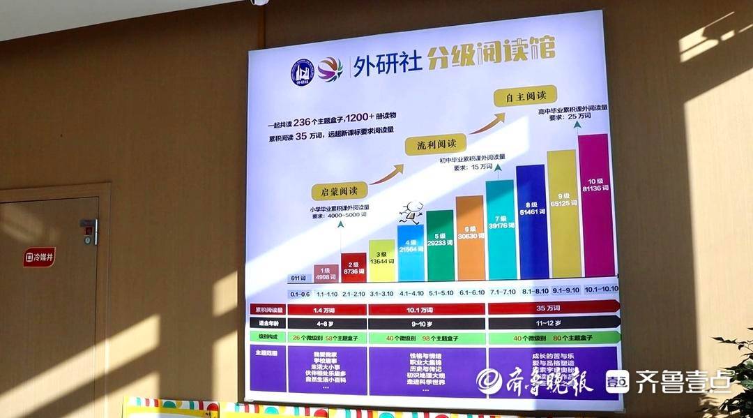 特色,成为他教育事业的鲜明注脚。高美武与团队探索出一条融合创新的育人路径:打破学科壁垒,将广博知识融入语言教学,践行“全人教育”;依托外研社专业资源,打造全国独有的主题式分级阅读馆——这是外研社推出的家庭阅读一站式解决方案,参照《中国中小学生英语分级阅读标准》,将12岁之前的读物分成11个级别、106个微级别,每个级别用不同颜色的盒子标识,方便读者直观了解难度递增,还配备了外研社联合中国英语阅读教育研究院共同研发的“悦测评”系统,可全方位考查孩子的解码能力、语言知识、阅读理解、文化意识四大能力,并生成详细的测试结果和报告,为孩子推荐合适的阅读级别,真正实现因材施教;引入人工智能技术,建设AI英语学习中心,为传统课堂注入智能化的活力。如今,他的实践更进一步:“现在,我们不仅提供英语分级阅读,还加入了中文分级阅读体系,让孩子们的母语与外语阅读能力同步发展、得到充分保障。”