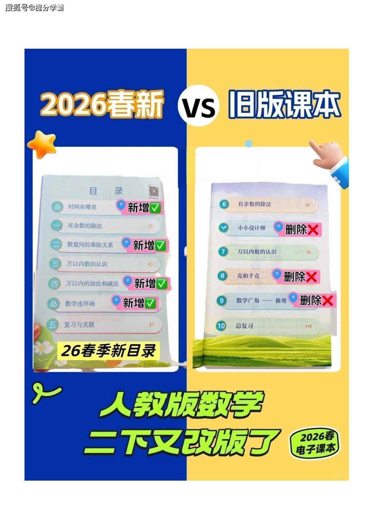 今天为大家分享:新学期刚启幕,人教版二年级下册数学教材就迎来了大调整!对比旧版,新版不仅删除了 “数据收集”“表内除法” 等单元,还新增了 “时间在哪里”“数量间的乘除关系” 等实用板块,其中 “时间在哪里” 单元更是以生活场景为核心,成了新版的亮点内容。