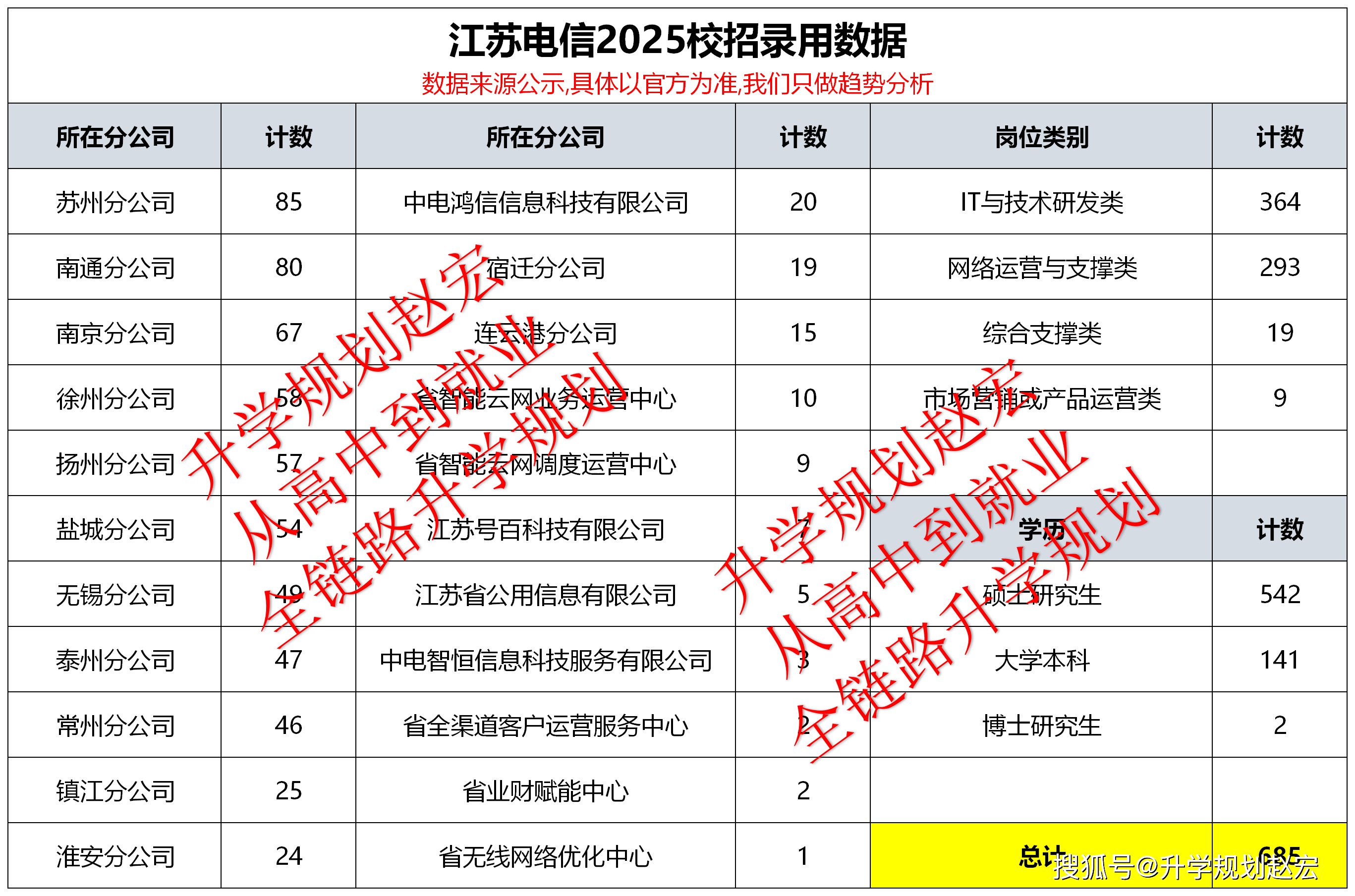 本文咱们来看看江苏电信2025校招录用情况,处理数据用的是软件,难免会有误差,不过对整体数据趋势不影响。总共685人,硕士研究生542人,博士研究生2人,大学本科141人,这个数据和三大运营商的录用大致差不多。岗位主要有IT与技术研发类、网络运营与支撑类、综合支撑类和市场营销或产品运营类。包含了江苏下属的各大公司,人数最多的是苏州分公司85人,然后是南通分公司80人和南京分公司67人,接下来是徐州分公司58人和扬州分公司57人。还有其他的一些单位。分公司的位置和学历有很大关系,县公司基本上本科,地域好和省公司基本上是研究生。接下来看看录用院校和专业情况。