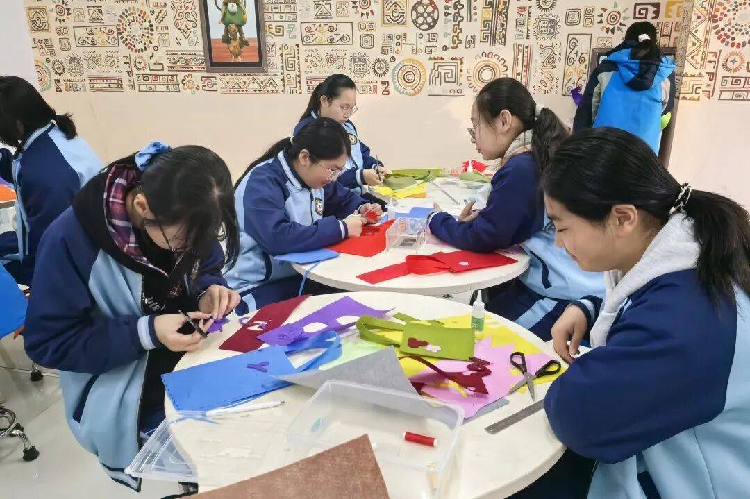 不织布手工课上,同学们手持彩布、针线与剪刀,从勾勒图案、裁剪布料到穿针引线、拼接缝合,一步步将零散的不织布变成精致的挂饰、小巧的收纳袋。在一针一线的专注中,大家感受着手工创作的乐趣。