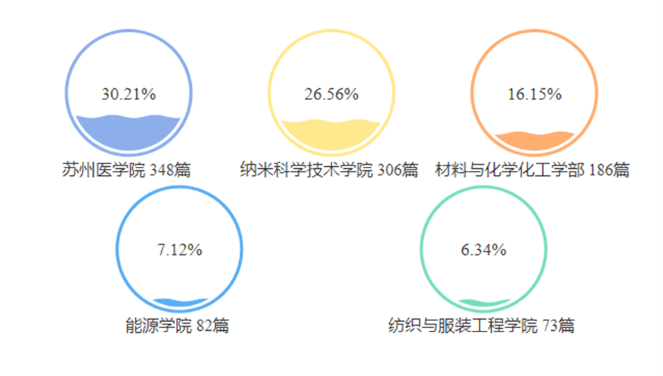 ESI高被引论文覆盖我校22个学院及科研机构,其中高被引论文Top5学院如图,苏州医学院、纳米科学技术学院和材料与化学化工学部的高被引论文数量名列前三。