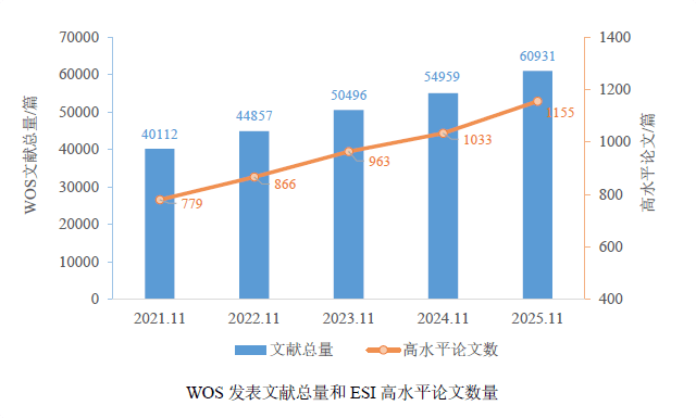 近年来,我校发WOS表论文总数与高水平论文数量稳步增长。其中WOS总发文量从2021年40112篇增加至2025年60931篇,ESI高水平论文数由2021年779篇增至2025年1155篇。