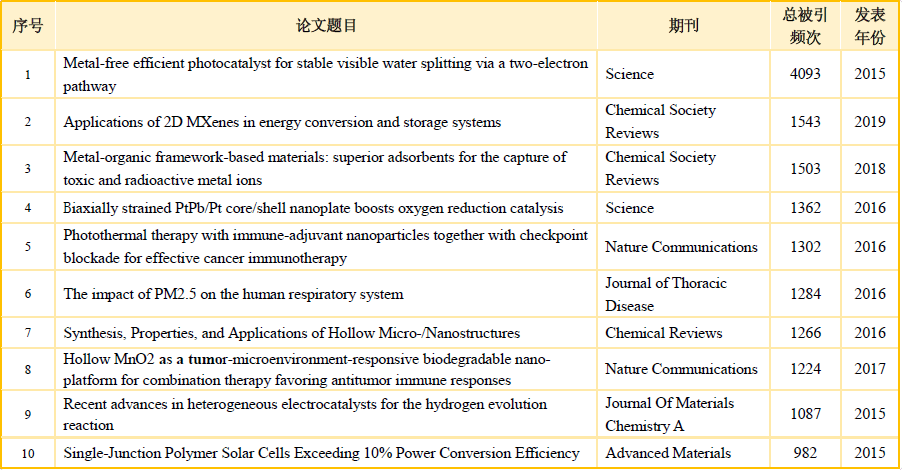 ESI高被引论文分布于21个学科(ESI共22个学科分类),学科覆盖全面。发文量Top5学科为:材料科学279篇、化学277篇、临床医学133篇、工程学118篇及物理学98篇。
