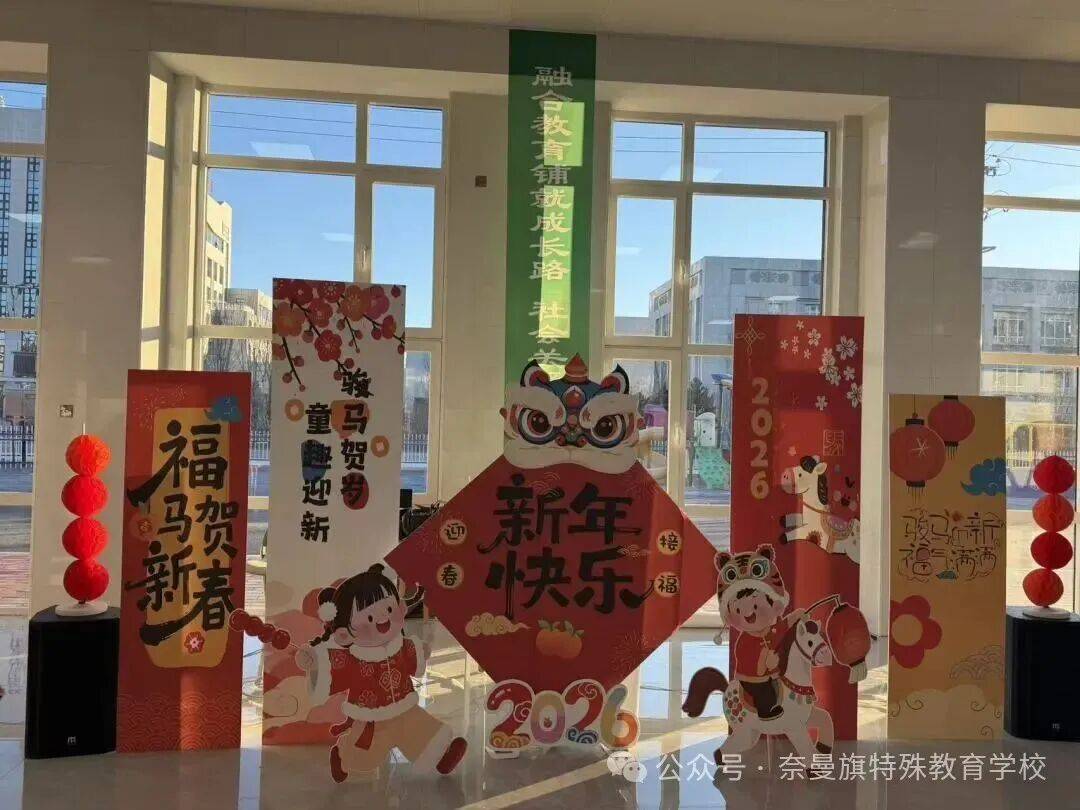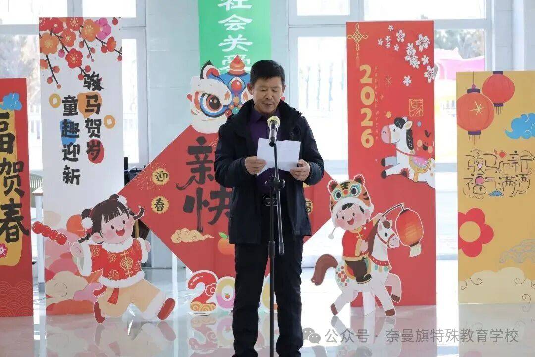 岁末暖冬辞旧岁,龙马精神迎新春。2025 年 12 月 30 日,奈曼旗特殊教育学校多功能厅张灯结彩、暖意融融,以 “跃马启新程 童梦共绽放” 为主题的 2026 年亲子元旦联欢会在此温馨举行。全校师生与家长欢聚一堂,用歌舞传递喜悦,用游戏凝聚温情,共同定格属于特殊孩子们的新年美好时光。