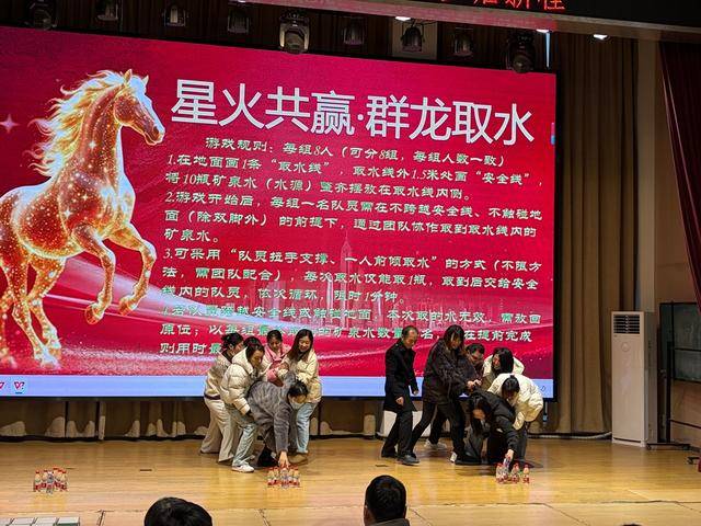 开场暖场环节,副校长侯伟斌详细介绍本次活动主题、完整流程及奖项设置,充分调动起教师们的参与热情。随后,校党支部书记、校长崔利军致迎新辞,为全体教师送上诚挚问候与美好期许。致辞结束后,趣味游戏环节正式拉开帷幕,本次活动依次开展“星火传意·企鹅运纸”“星火聚力·篓筐接球”“星火共赢·群龙取水”三项趣味比拼,每组完成一项游戏后即时统计成绩,以公开透明的规则保障赛事公正。教师们通过抽签分组竞技,各组队员人数均衡,大家齐心协力、奋勇争先,在赛场尽显别样风采。