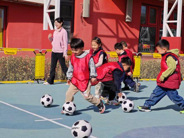 雄安新区幼儿园儿童在踢足球。