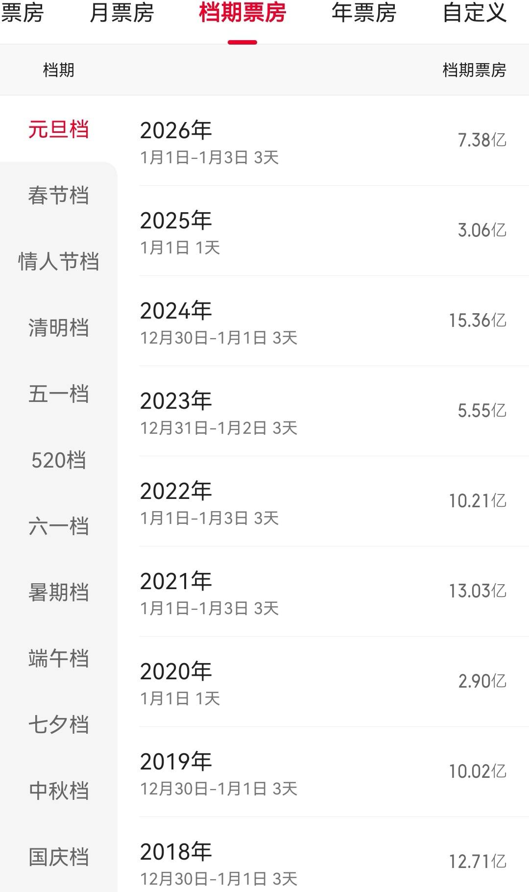 搜狐娱乐讯 (哈麦/文)2026年元旦档三天,全国电影票房累计近7.4亿元,远不如2024元旦档三天的15.36亿元。