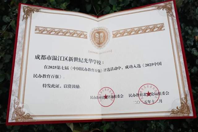 经过严格遴选与权威评审,成都市温江区新世纪光华学校凭借先进的办学理念,扎实的办学积淀、鲜明的育人特色与卓越的教育成果,成功入选“2025年中国民办教育百强(中学50强)”。