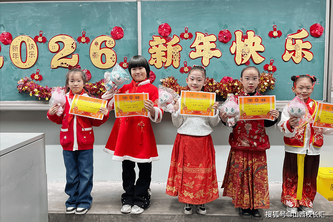 四年级活动则以“聚力竞秀启新年,童心欢悦庆元旦”为主线,突出展示、互动与共享。各班教室被气球、彩带、窗花和福字装点一新,洋溢着温馨喜悦。