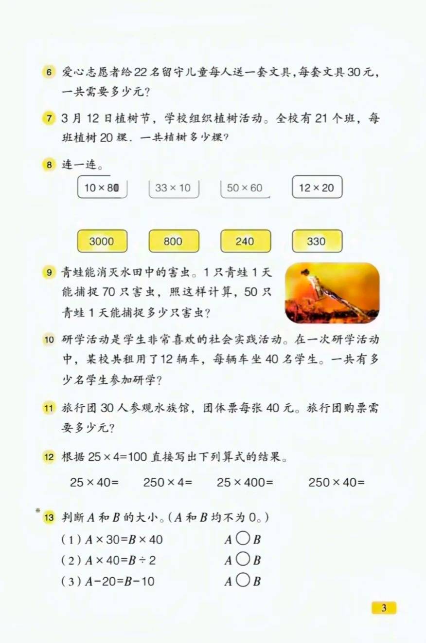 后续的 “美化家园” 环节,进一步延伸到两位数乘两位数的竖式计算:通过 “花坛用了多少盆花” 的问题,展示 “拆成 2 排 + 10 排计算”“表格拆分法”“竖式计算” 等多种方法,既教算法,也让学生理解 “为什么这样算”。每个知识点后搭配的练习,也都是 “给留守儿童买文具”“植树节种树” 这类真实场景,练计算的同时,也能感知数学的实用价值。除了运算,教材还设置了 “分数的初步认识”“数据的收集与整理” 等模块,同样以 “分餐”“体育健康” 等生活主题切入,避免了知识的枯燥感;“智慧广场” 的逆推内容,则通过简单逻辑训练,慢慢培养学生的思维能力。