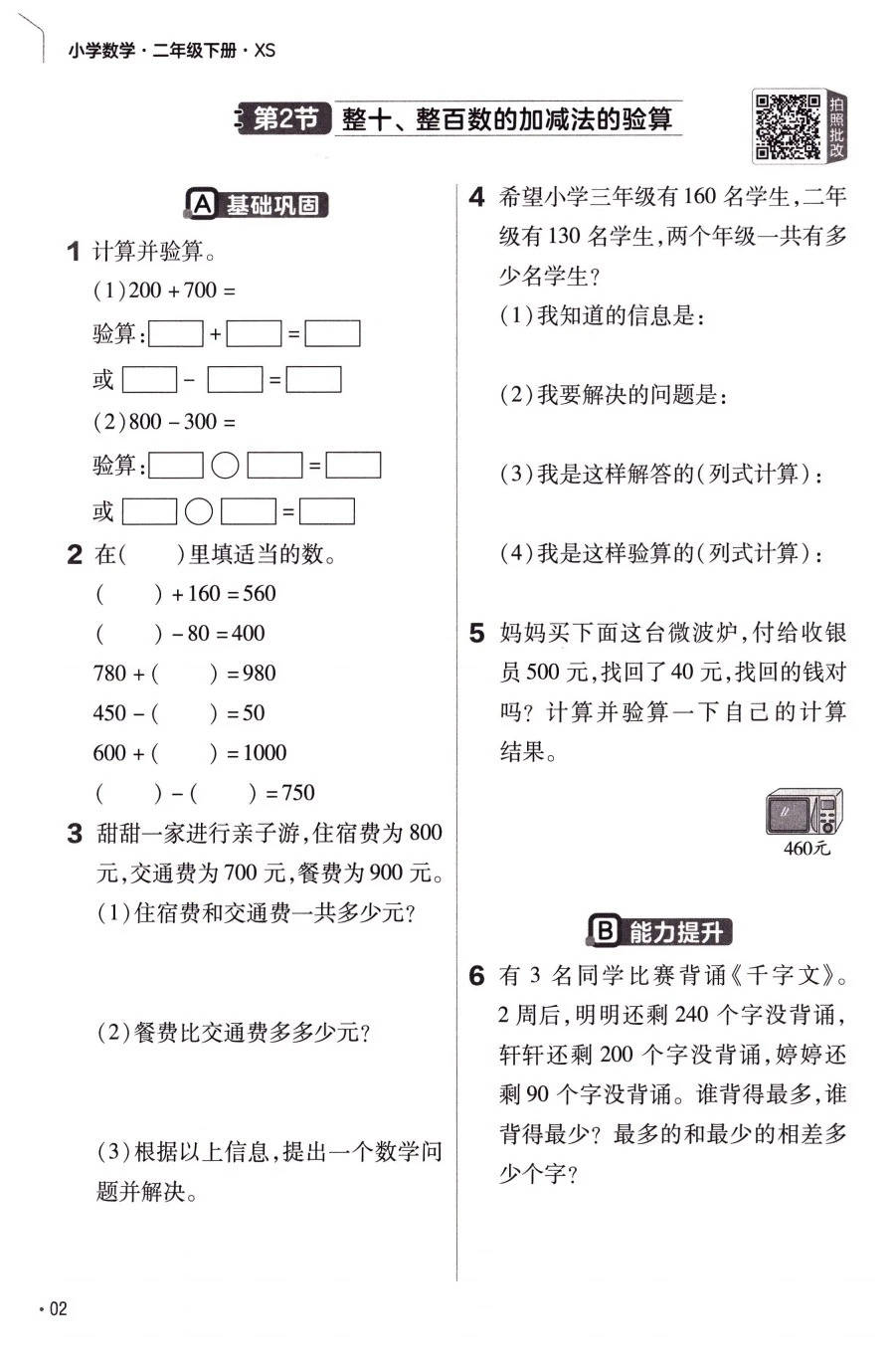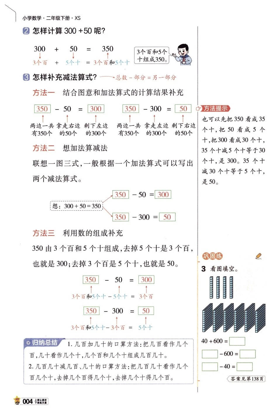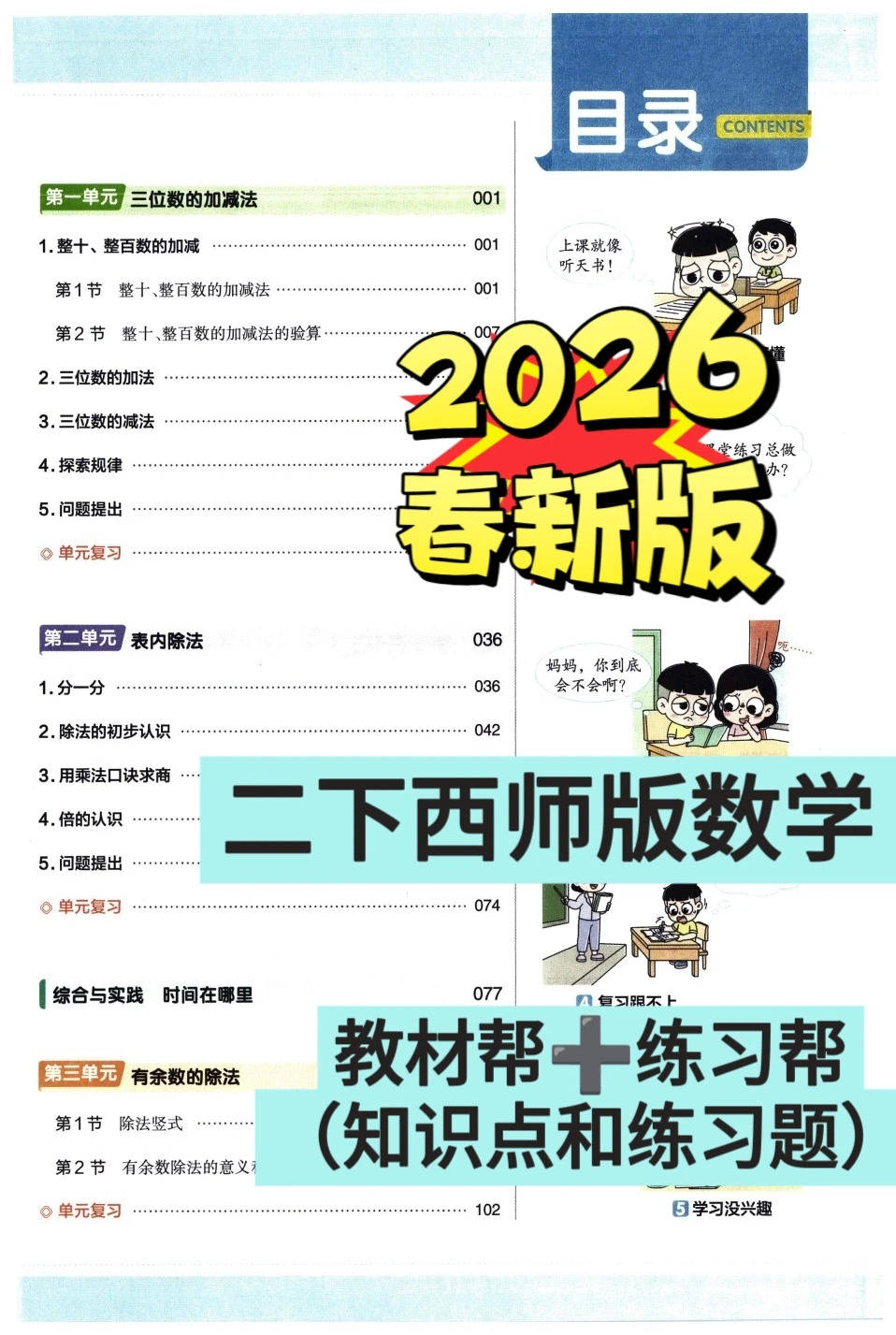 2026 春西师版二年级下册数学《教材帮 + 练习帮》直接把 “三位数的加减法” 单元做成 **“算理拆解 + 方法拓展 + 思维训练” 的提分通关包 **:从整十 / 整百数的口算(数的组成、转化法),到几百加几十的加减运算,连 “填数推理题” 的解题逻辑都手把手教,还配套单元复习、综合实践,学习像解锁 “数学运算任务副本”!