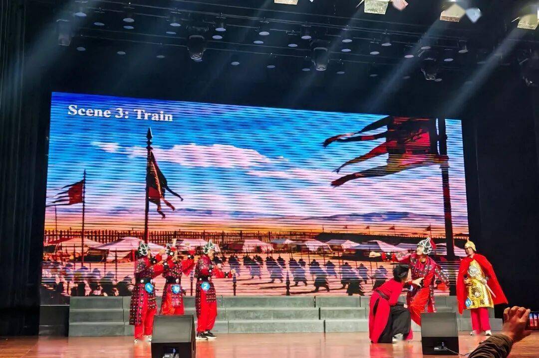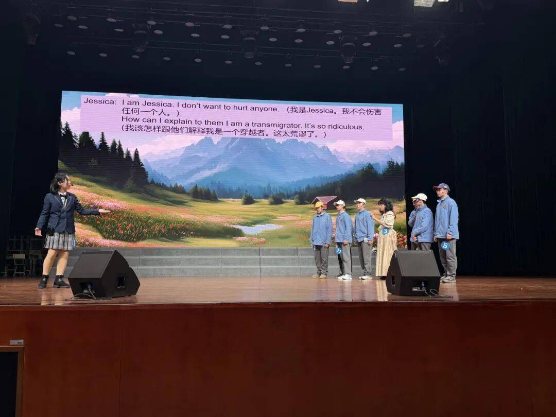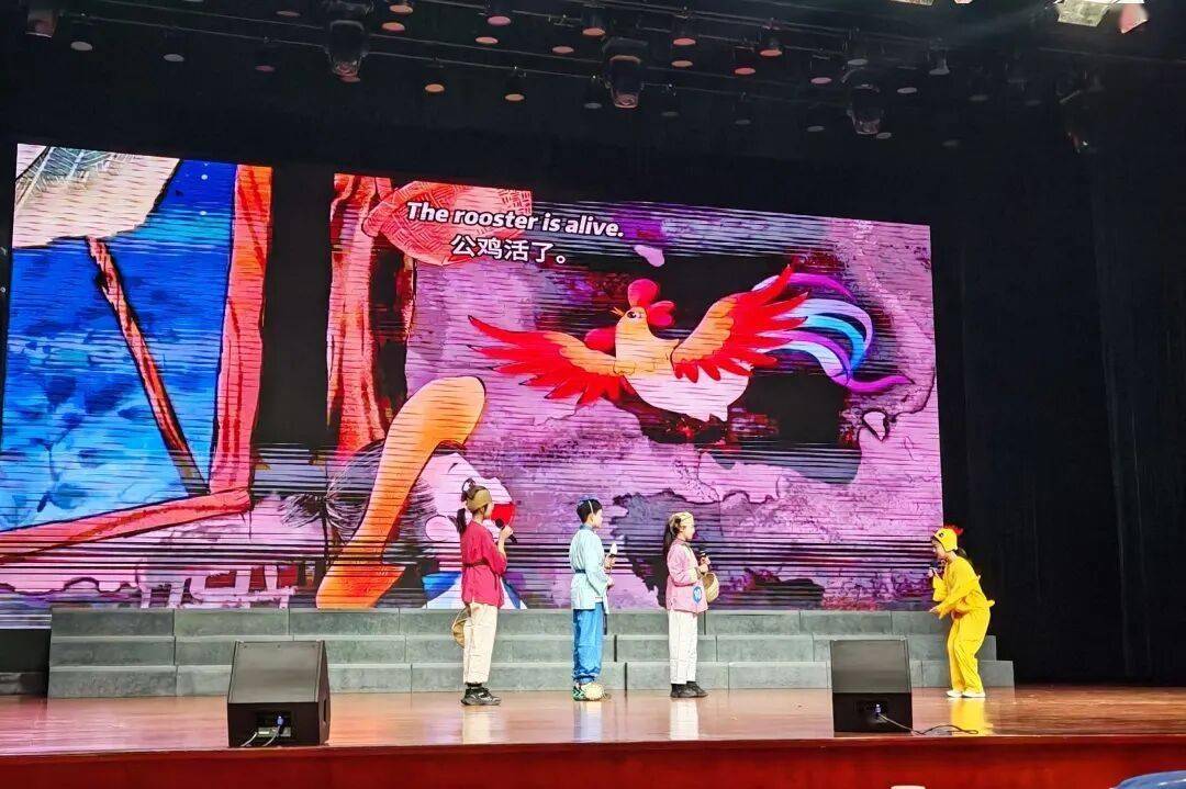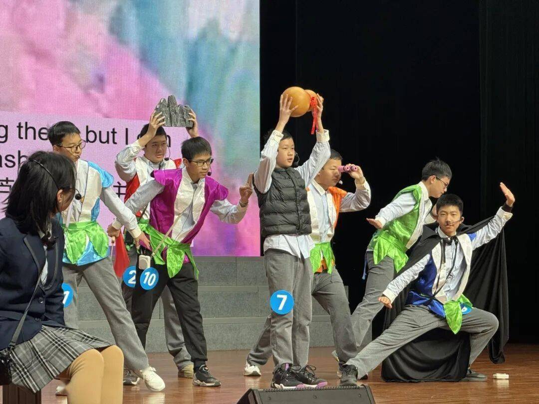 本次比赛的参赛剧目题材覆盖面广、立意深刻多元,堪称一场“百花齐放”的文化展演。我校参赛作品《武林外传・秀才智斗姬无命》,在王灿、陆小双、马文静三位老师的悉心指导打磨下,同学们凭借地道流利的英语,生动复刻了同福客栈的名场面。