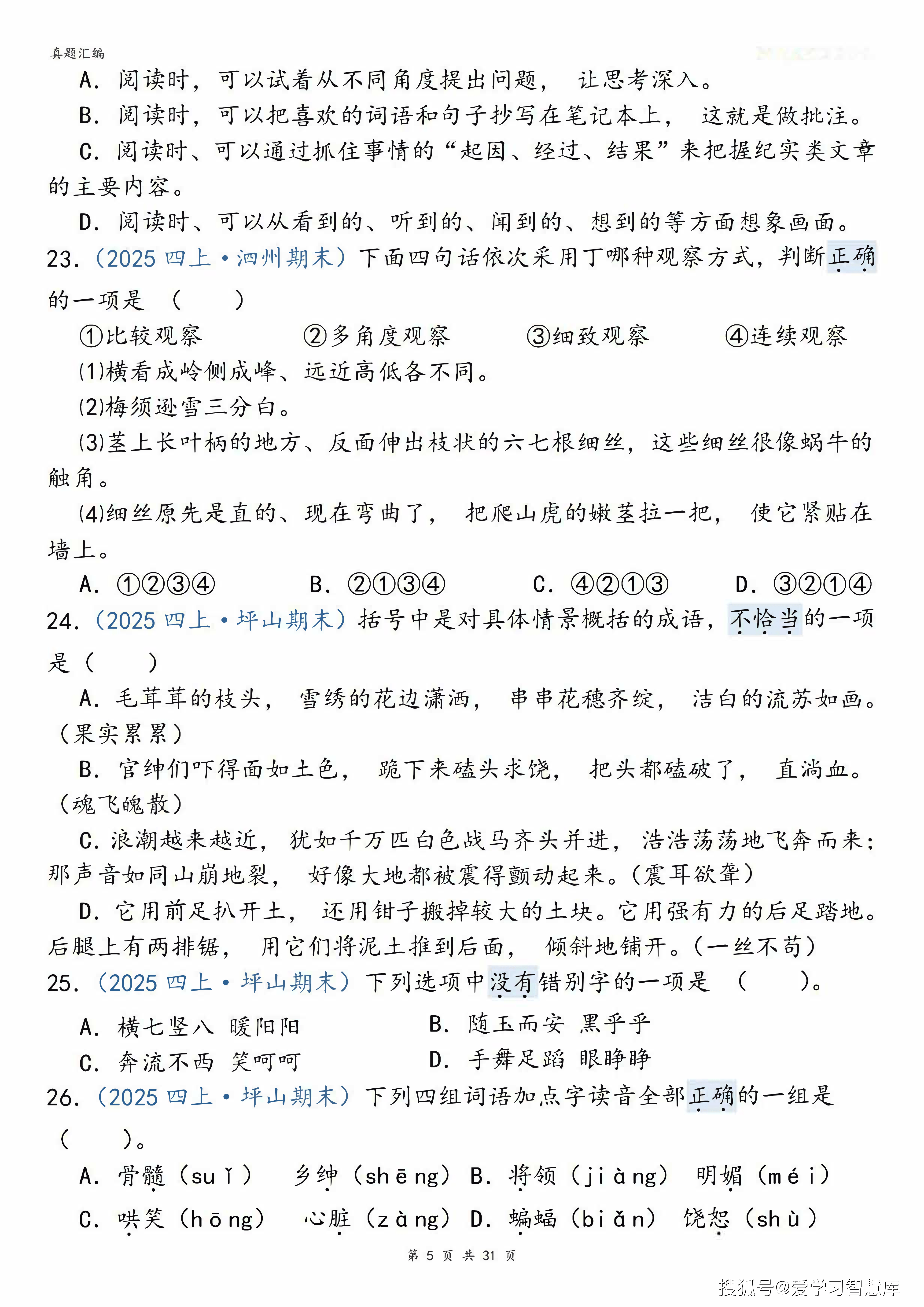 四年级上册语文期末复习综合选择题150道真题(电子版可打印)