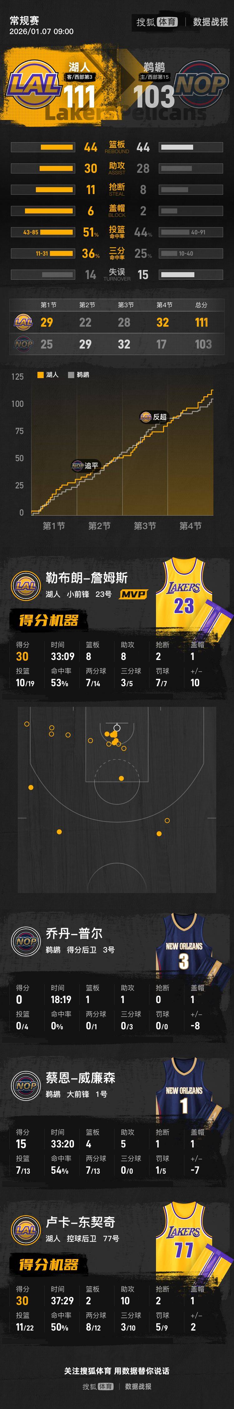 在最后一节,鹈鹕开局状态不佳,湖人抓住机会展开反击,不仅抹平了比分,还一度领先11分。随着时间推移,鹈鹕逐渐找回感觉,努力追近比分。湖人的詹姆斯在本节中表现出色,贡献了10分,其中包括2记三分球,最终湖人以111-103赢下比赛。