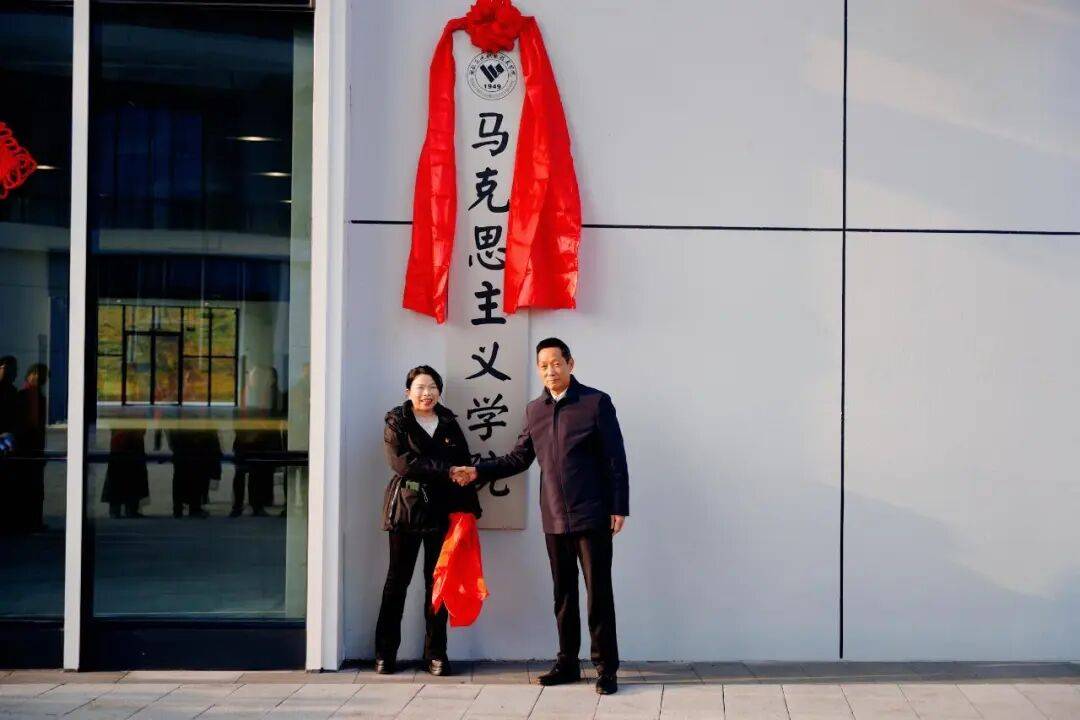 马克思主义学院是学校落实立德树人根本任务、承担思想政治理论课教育教学和理论研究的核心单位,进驻江南校区楚凤楼。王军与马克思主义学院院长曾智一同为学院揭牌。曾智在致辞中表示,立足新校区新起点,马克思主义学院将当好“先头兵”,做好“大先生”,建好“特色院”,为推动学校高质量发展彰显马院新担当。