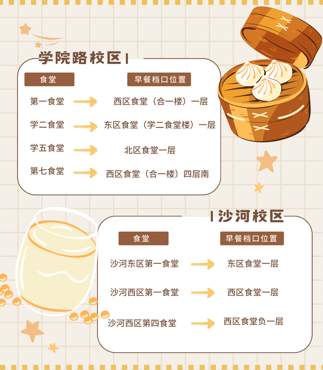 学生需要凭一卡通在早上7时之前到食堂就餐,免费早餐的供应期为1月5日—18日。就餐地点在中关村校区第三、四食堂(新食堂一层)和良乡一、二、四号食堂(一层)。