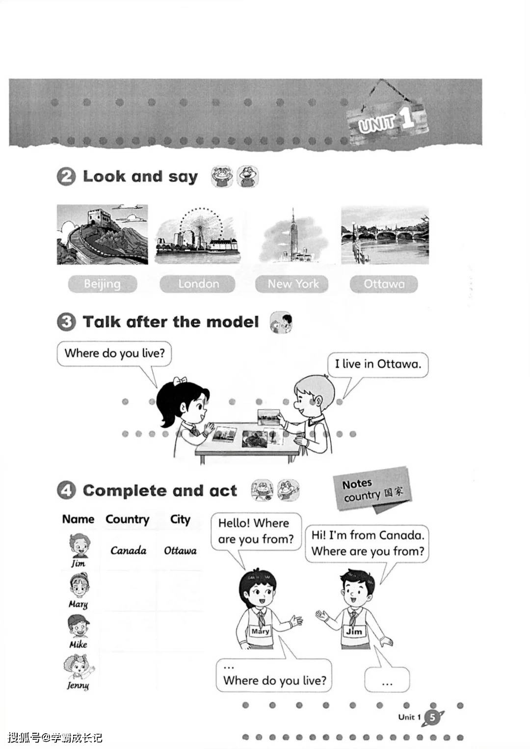 先看第一单元 “Foreign friends in China”,上来就是 “你住哪儿”“你是哪国人” 的对话。课本里配了长城、伦敦眼的图,娃指着伦敦眼问 “这是摩天轮吗”,顺带着就把 “London” 和 “live in” 记下来了。最妙的是它把 “介绍自己” 拆成了几句简单的话,不用背长课文,照着 “我住 XX,我喜欢 XX” 的模板就能说,上周娃还对着玩具熊练 “它是我的朋友,它喜欢蜂蜜”,把英语说成了 “碎碎念”。