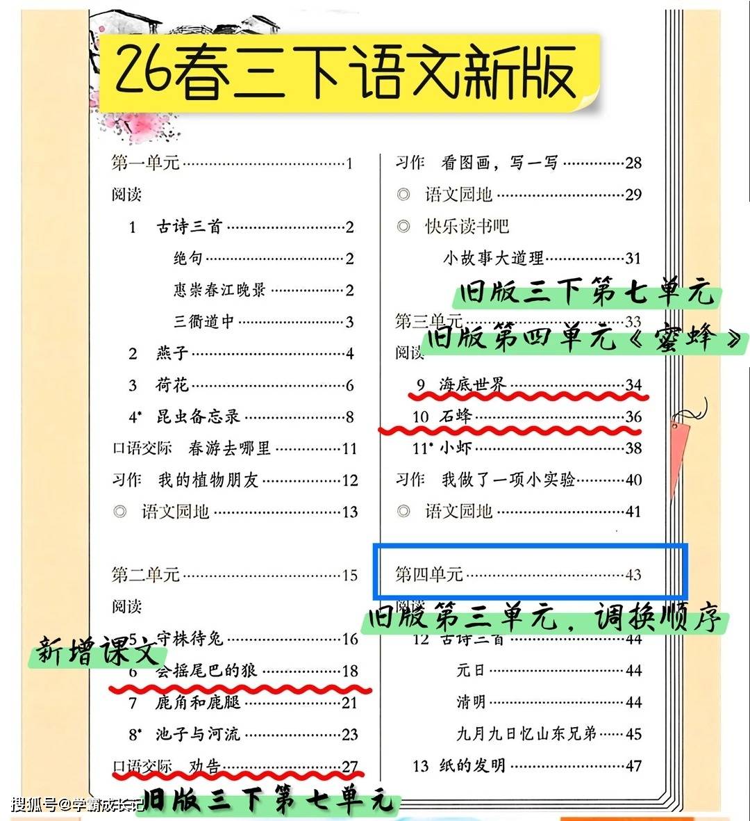 今天为大家分享:2026 春三下语文新版和旧版差不少,有些课文挪了单元,有的直接换了篇目,连阅读节奏都跟着变了。翻着新旧版目录的红叉绿线,倒像摸清了一份 “小学生阅读更新指南”。