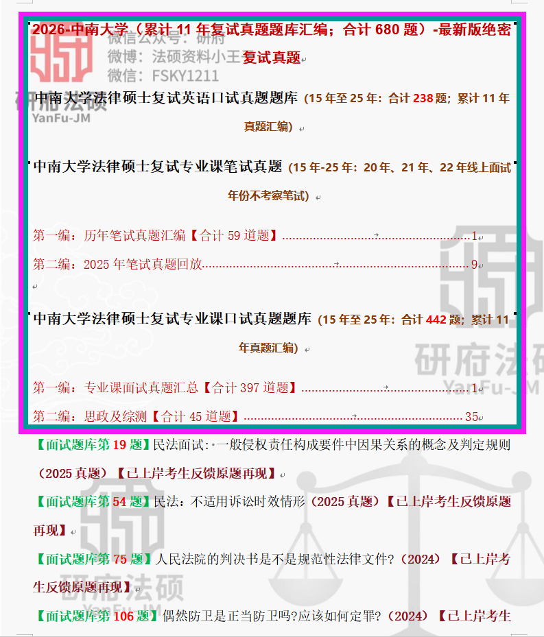 中南大学法律硕士复试专业课口试真题题库(15年至25年:合计442题;累计11年真题汇编)