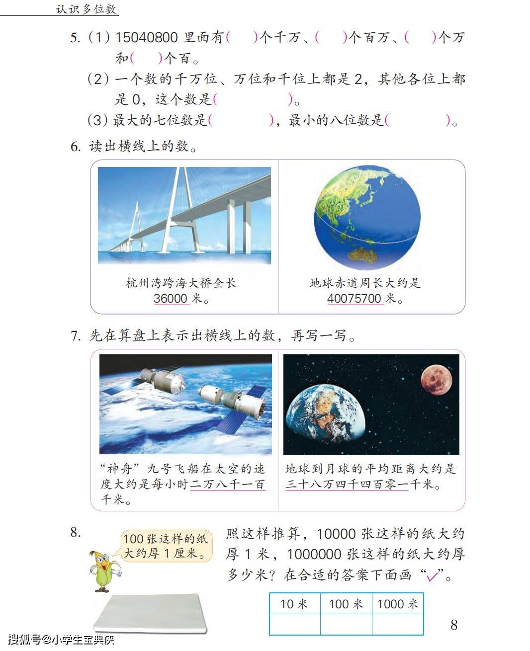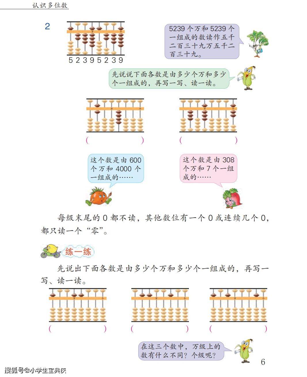 本章内容主要包括以下几个方面:首先是认识更大的计数单位,从 “万” 扩展到 “亿”,并理解每相邻两个计数单位之间的十进关系。其次是学习数级概念,掌握个级、万级、亿级的划分方式,认识数位顺序表,能根据数位判断数的大小和组成。第三是掌握多位数的读法和写法,包括含 0 数的读写规则,例如每级末尾的 0 不读,其他位置连续的 0 只读一个。第四是通过算盘拨珠、数的分解与组合等方式,帮助学生在操作中理解大数的结构。此外,教材还介绍了国际上的三位分节法,让学生了解不同的计数习惯。