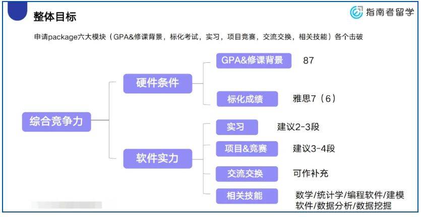 GPA方面,我们建议其在概率论、复变函数、实变函数、数据结构与算法等数学基础课,以及数据库系统与应用等专业技能课程上往90分的目标进行冲刺;