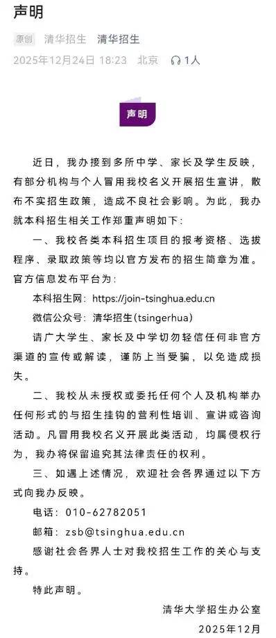 2025年12月24日,清华大学招生办发表声明称,接到多所中学、家长及学生反映,有部分机构与个人冒用该校名义开展招生宣讲,散布不实招生政策,造成不良社会影响。清华大学从未授权或委托任何个人及机构举办任何形式的与招生挂钩的营利性培训、宣讲或咨询活动。