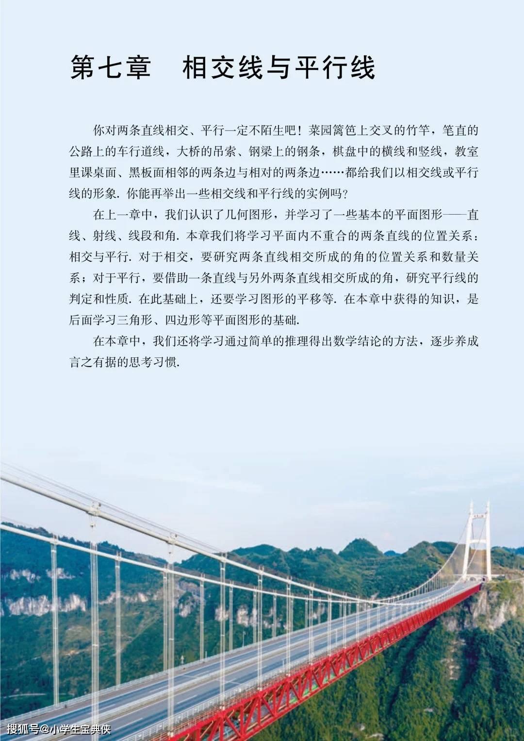 教材开篇以桥梁、公路等生活场景切入,从相交线的对顶角、邻补角性质,到平行线的判定与性质,再到图形的平移,引导学生通过直观想象、操作确认、推理论证等方法,初步体会严谨的几何推理,培养 “言之有据” 的思考习惯。这不仅为后续三角形、四边形的学习筑牢基础,更能让学生理解 “数学结论需要逻辑支撑” 的学科本质。