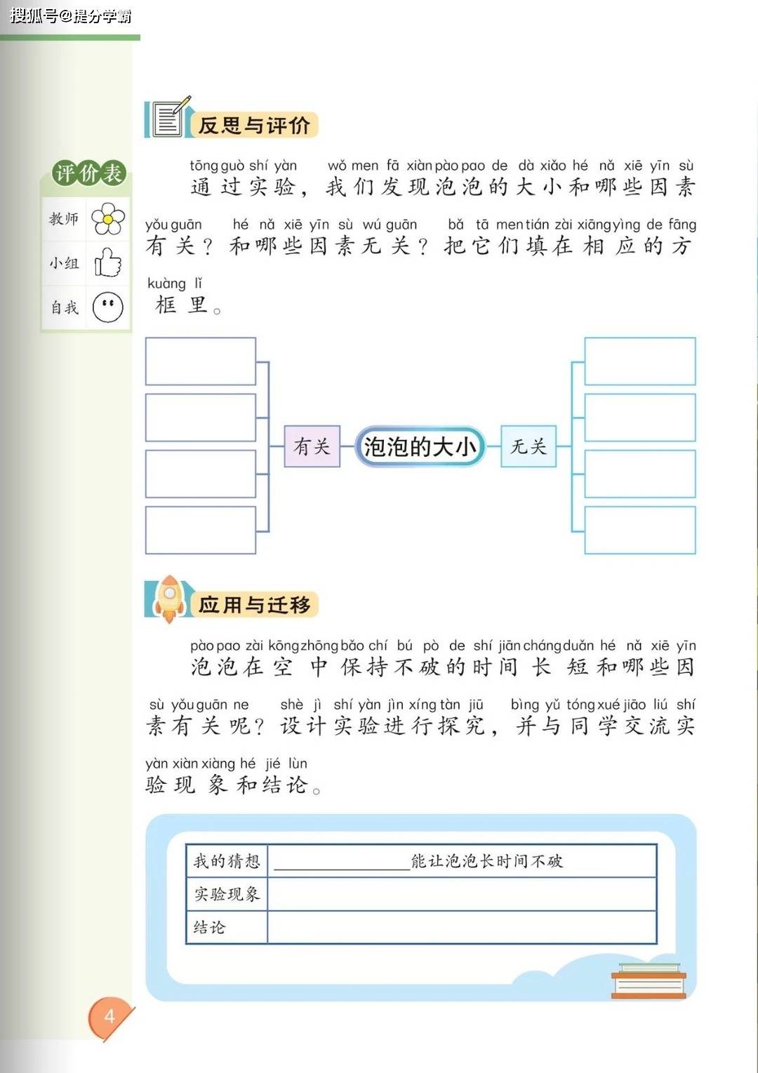 教材核心内容包括:体验单元 “吹泡泡 找联系”,通过实验探究泡泡大小的影响因素,让学生初步掌握 “问题 - 猜想 - 探究 - 结论” 的科学思维方法;第一单元 “小小工程师”,通过制作纸蜻蜓、承重纸桥、载重小船等任务,培养学生的动手能力与工程思维;第二单元 “季节变化”,引导学生探访春天、观察四季特征,了解季节对动植物的影响;第三单元 “植物的生长”,通过发豆芽、观察豆苗发黄、发蔫的现象,探索植物生长的条件;第四单元 “共同的家园”,走进大山里的生活,了解自然环境与动植物的关系,为小鸟搭建家园;反思单元 “彗星与灾难有关吗”,则通过科学史拓展学生的认知视野。