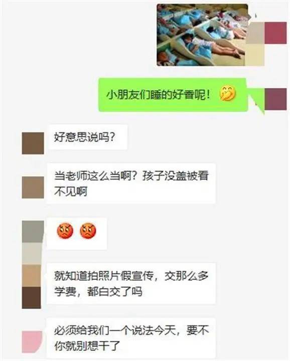 可偏偏照片中,有几个孩子的被子滑到了一旁,没有完全盖好。 有家长立刻在群里发难: