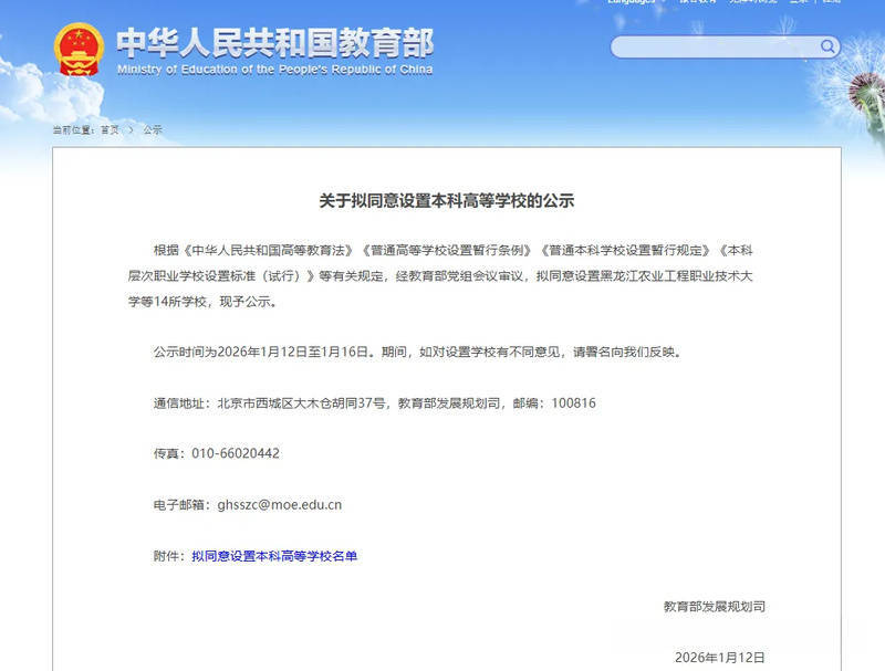 1月12日,教育部发布《关于拟同意设置本科高等学校的公示》,拟同意设置黑龙江农业工程职业技术大学等14所学校。在14所学校中,其中8所为职业本科高校,包括江苏建筑职业技术大学。