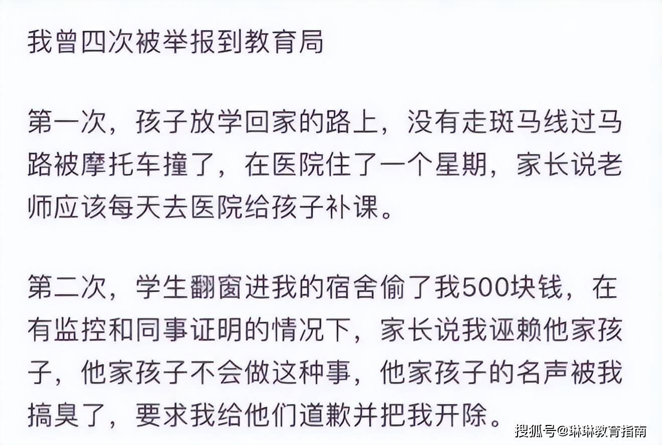 这名江西的一线教师,短短一年时间就被家长投诉了四次,且每一次投诉的理由都令人无奈,第一次是学生放学回家没有走斑马线被车撞了,需要住院一个星期,家长就要求老师每天给学生补课。