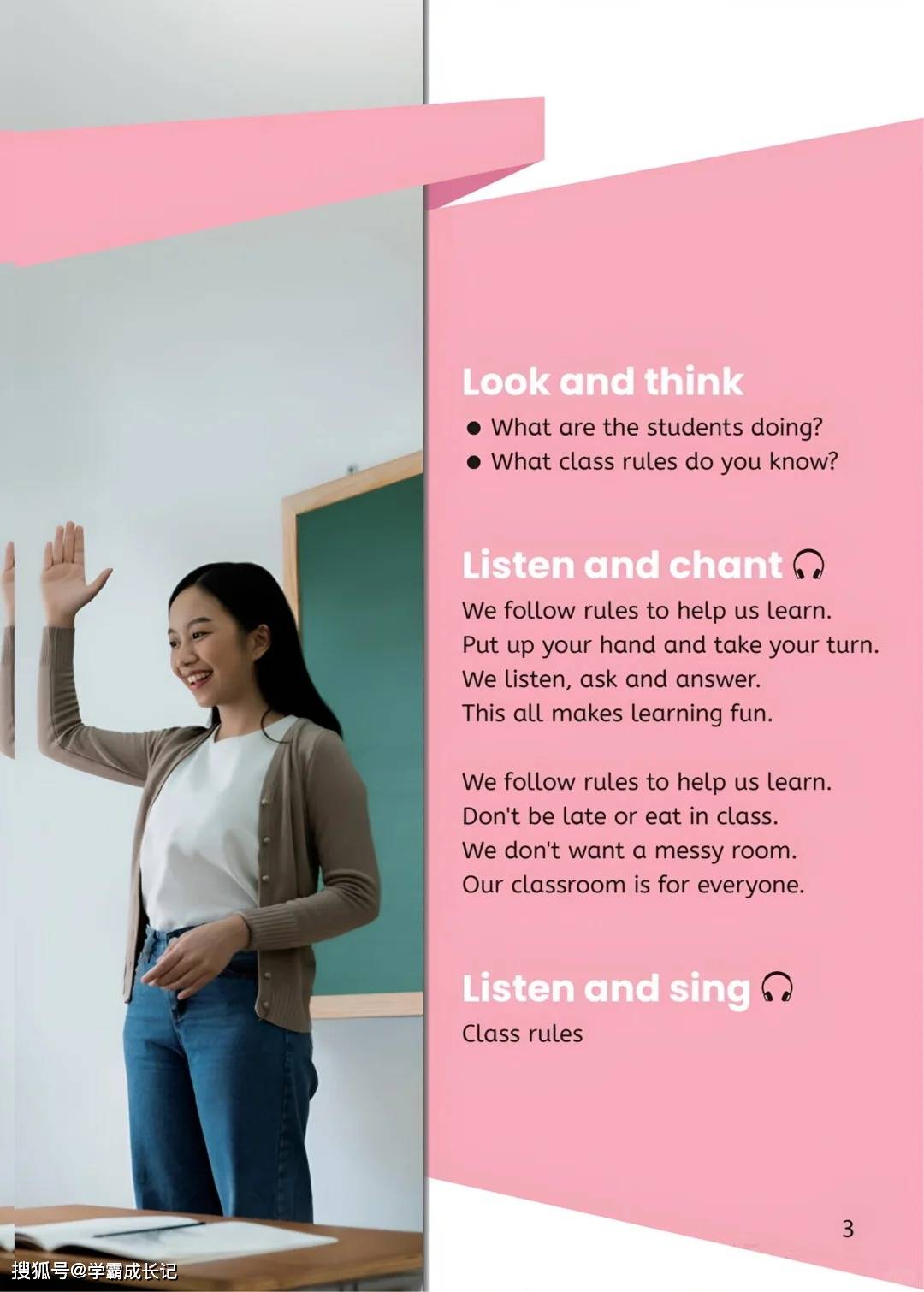 今天为大家分享:新学期的第一堂英语课,不少四年级孩子的课本里,出现了 “Class rules” 这个新鲜又熟悉的主题。当卡通对话里的杰克被提醒 “不能带玩具来学校”,当朗朗上口的歌谣唱着 “Put up your hand and take your turn”,孩子们在跟读模仿的同时,也在悄悄理解:规则不是束缚,而是让集体生活更顺畅的默契。