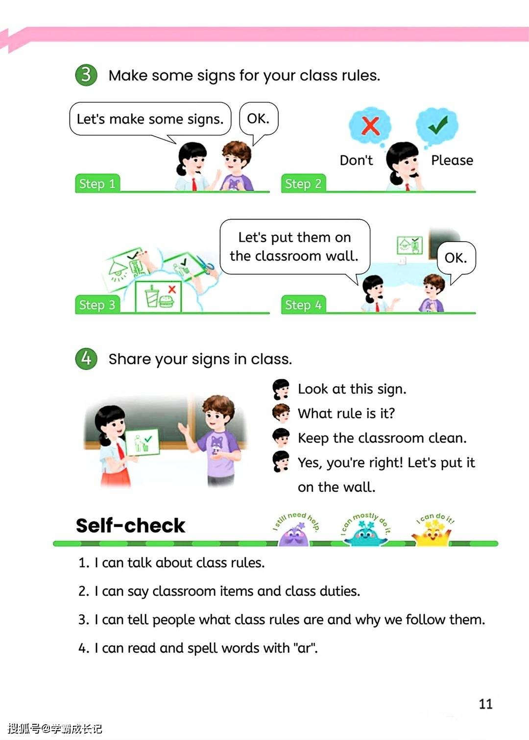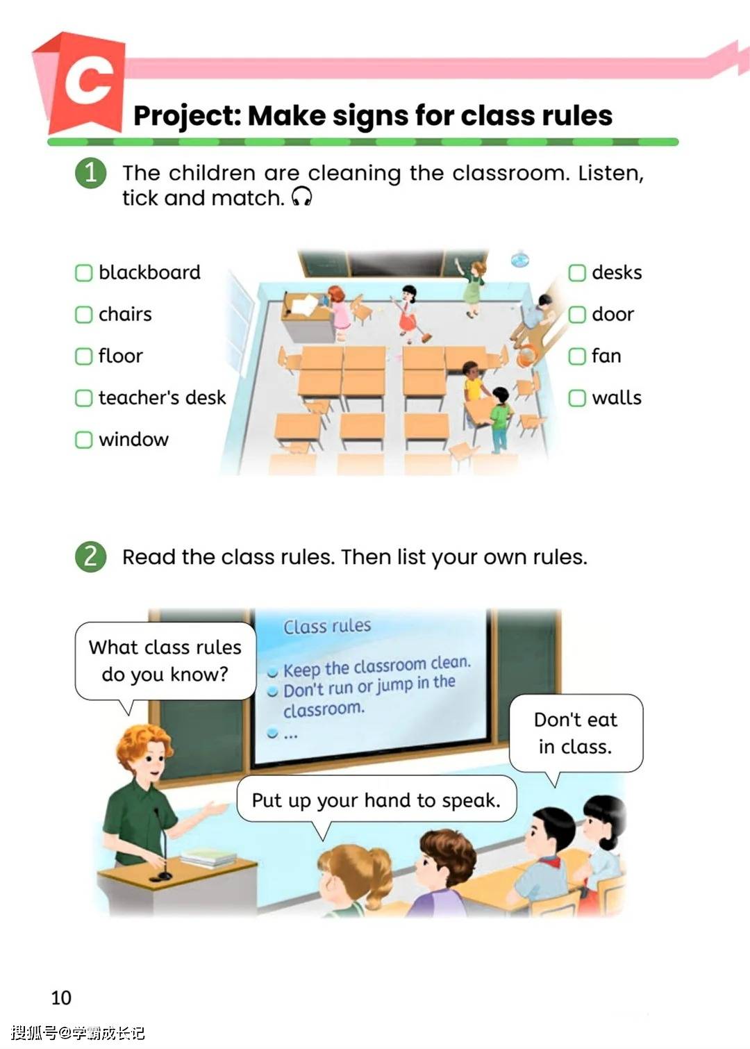 更值得一提的是教材里的 “Project” 环节。孩子们需要分工合作,先听录音匹配教室里的清洁区域,再一起讨论制定自己的班级规则,最后动手制作图文并茂的标语。这个过程中,英语成了沟通的桥梁,孩子们用英语商量任务、表达想法,在完成项目的同时,既锻炼了语言能力,又培养了团队协作和公共意识。