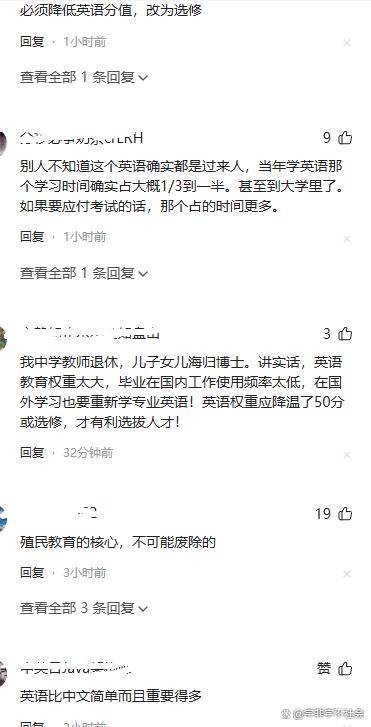 这话瞬间让不少家长感同身受,纷纷举双手支持。有家长吐槽:“现在英语都卷到幼儿园了!我家娃三岁就被催着报启蒙班,一年好几万,就为了背几个水果、动物的单词,纯属折腾孩子。” 还有人算过一笔账:从小学到高中,孩子花在英语上的时间,比物化生加起来还多,可高考完上了大学,除了过四六级,毕业找工作根本用不上。