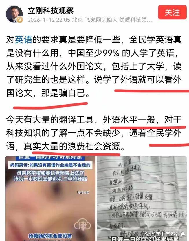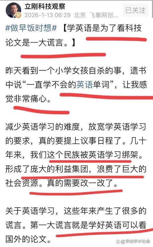 这事儿一出来,全网都在讨论英语教育。信息领域的项立刚更是直接喊话:“说学英语是为了看科技论文,纯属彻头彻尾的谎言!” 还呼吁把中高考英语权重降一半,减少中小学英语要求,说这才是给孩子真正的减负。