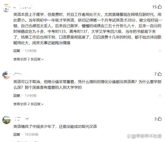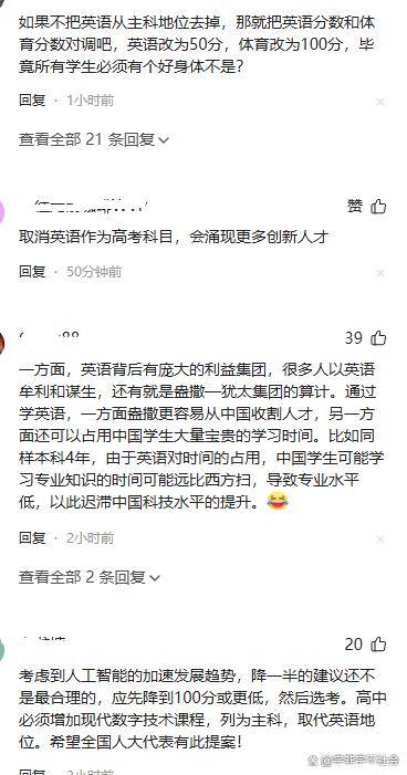 更有人提到,高考是选拔拔尖人才的,需要考察综合能力,英语作为国际通用语言,学习它有必要。就像有老师说的:“现在是全球化时代,让孩子早点接触英语,培养语言感知力,没什么错。而且英语阅读的逻辑要求,比语文阅读简单,好好学都能出成绩。”