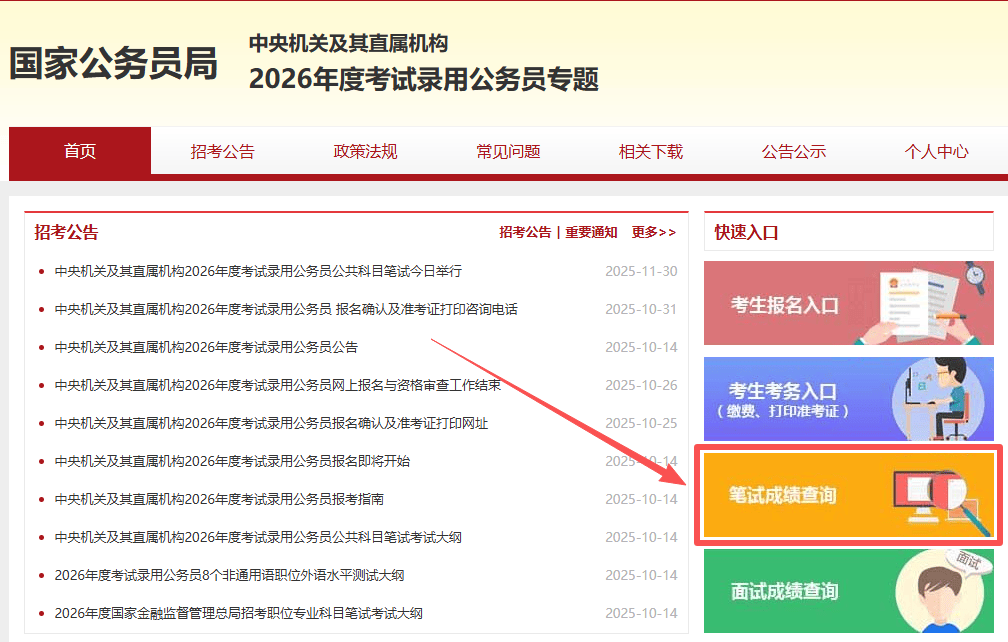 成绩发布后,我们可以进入2026国考招录专题界面,点击“笔试成绩查询"或“个人中心”按钮,输入个人信息即可查询到自己的笔试成绩啦。