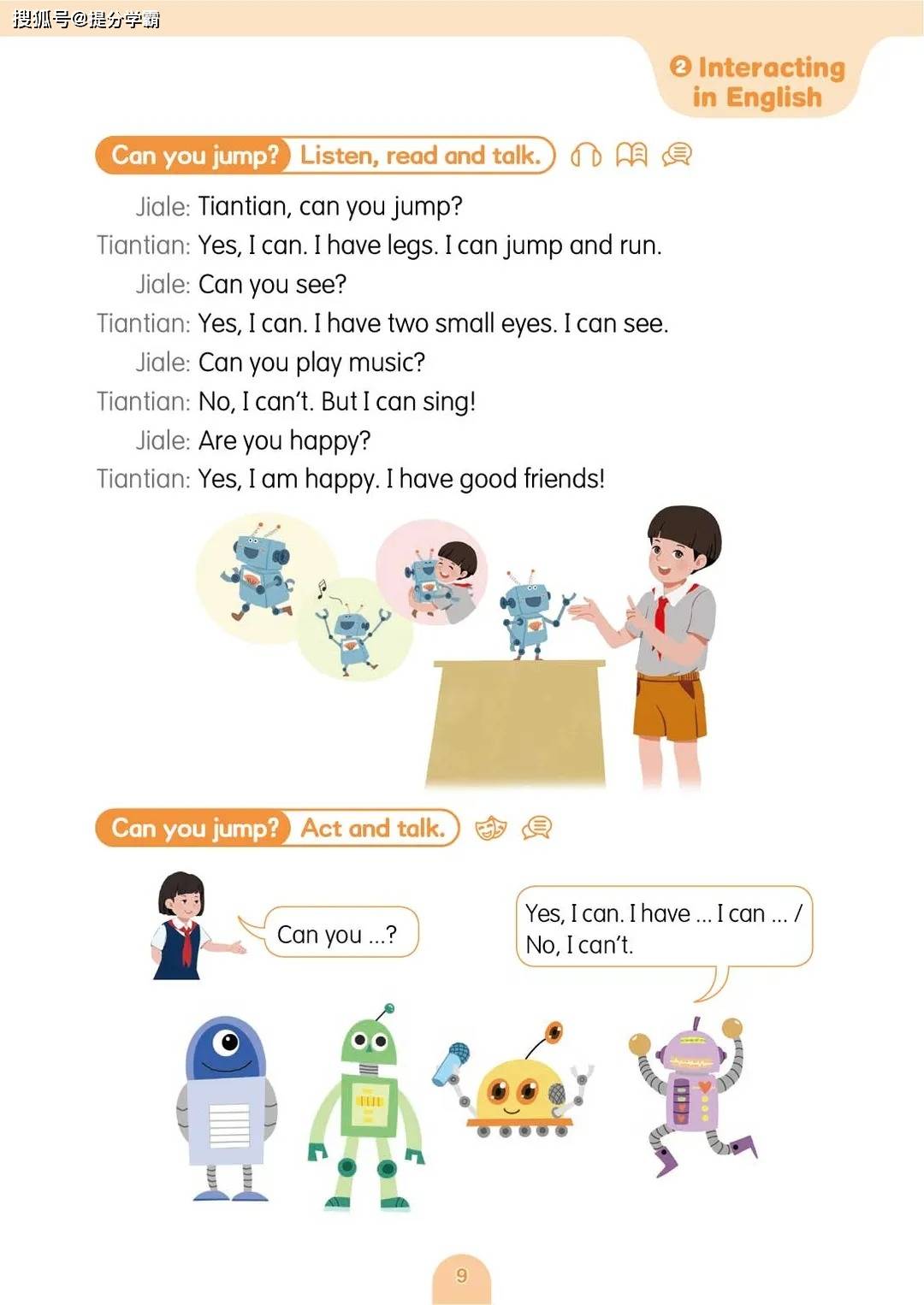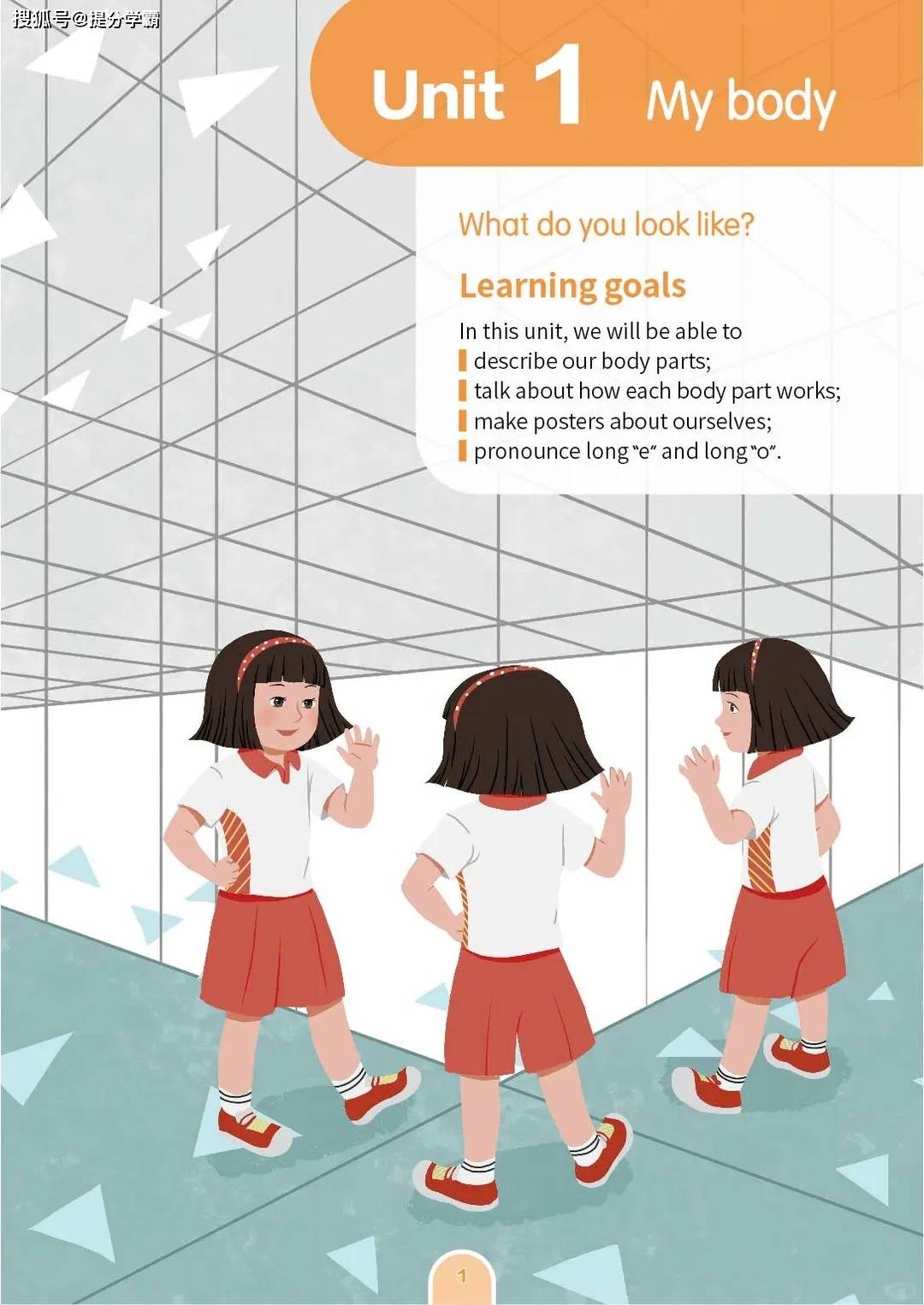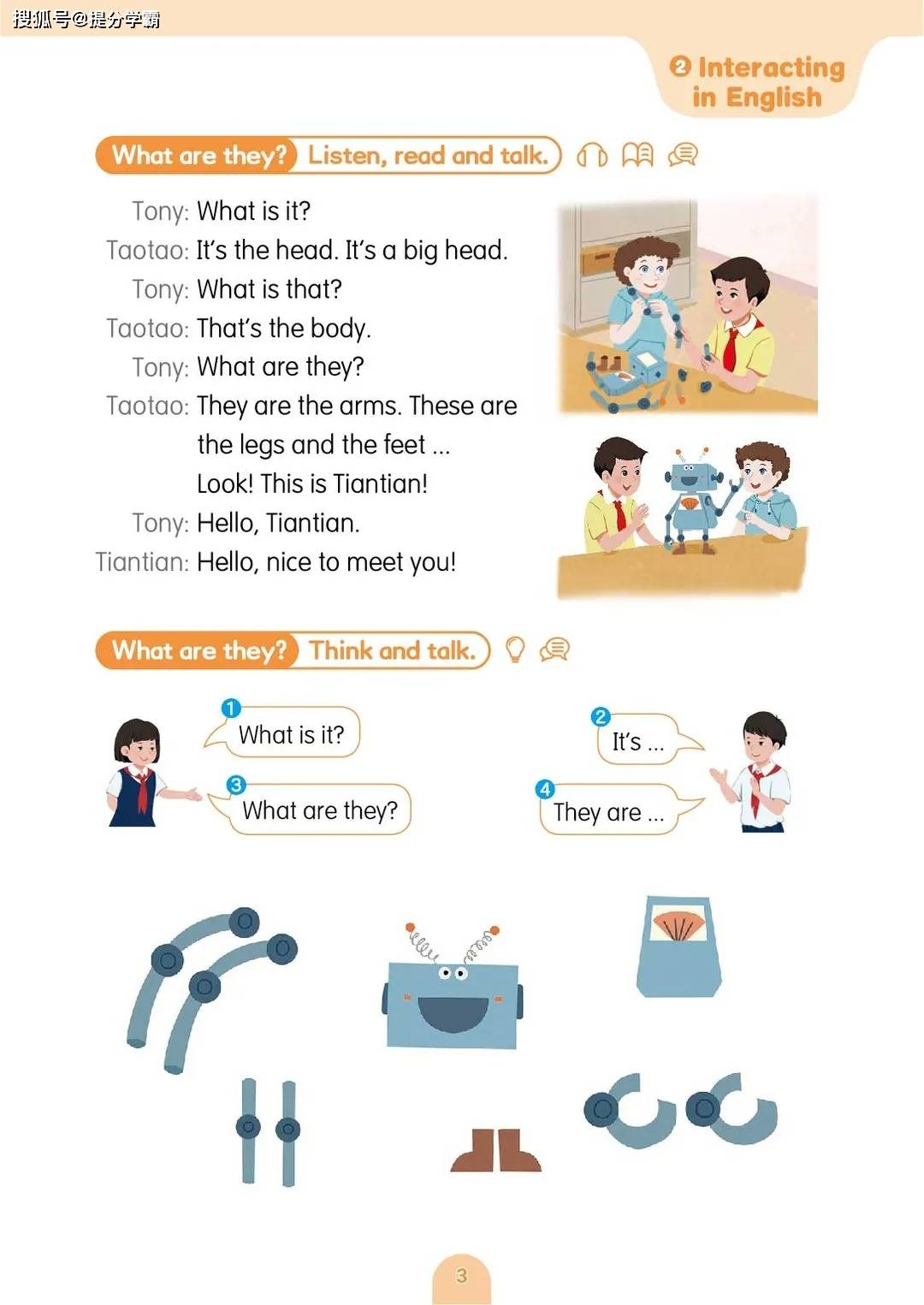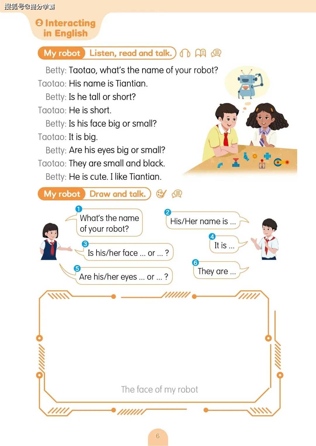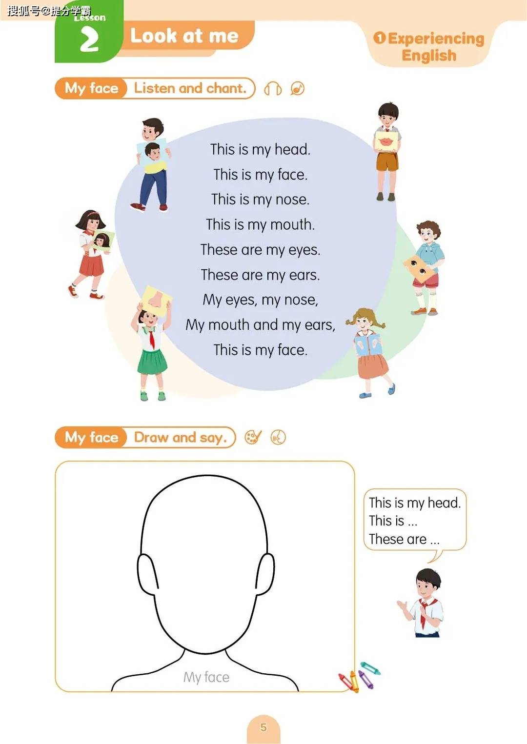 教材设置了五个贴近孩子生活的主题单元,层层递进,逻辑清晰。第一单元 “My body” 从孩子最熟悉的身体部位切入,通过生动的歌谣、机器人互动等趣味形式,让孩子在唱跳与绘画中轻松掌握 “head”“arm”“leg” 等基础单词,学会用 “This is…”“These are…” 等句型描述外貌特征,不仅锻炼了语言表达,更增强了自我认知。第二单元 “At school” 将场景延伸至校园,引导孩子用英语介绍教室设施、讨论校规校纪,在学习 “library”“classroom” 等词汇的同时,培养遵守规则的意识与礼貌表达的习惯。