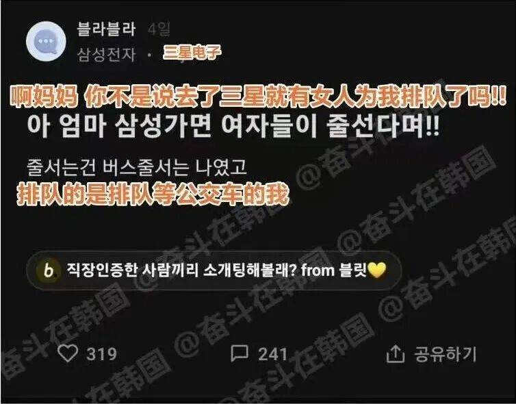 韩联社报道,2024年,韩国五大企业集团的销售额占到了全国GDP的40%,仅三星集团一家的营收,就扛起了韩国GDP的13%。这种优势地位甚至延伸到了婚恋市场。曾有韩国网友发帖:“妈妈,你不是说去了三星就有女人为我排队了吗?”