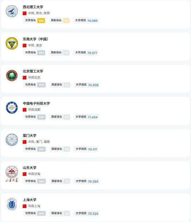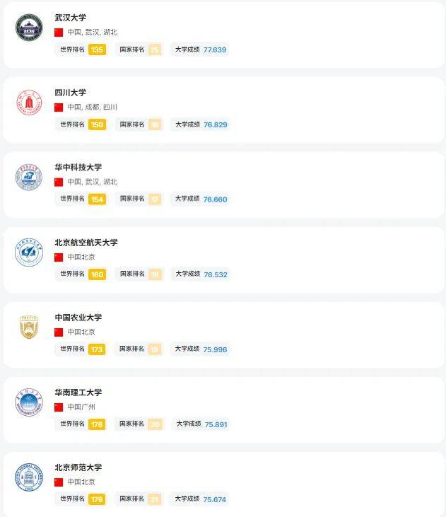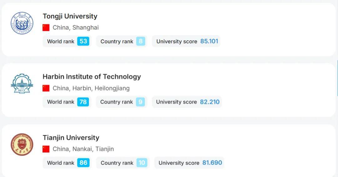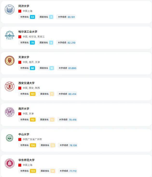 值得注意的是第八到第十七名的位次,同济大学居于第八,世界排名五十三,这个位置高出许多人的想象,哈工大排第九,天大排第十,两所老牌工科强校均进入了前十,特别是天大,全球八十六位的成绩颇为瞩目。
