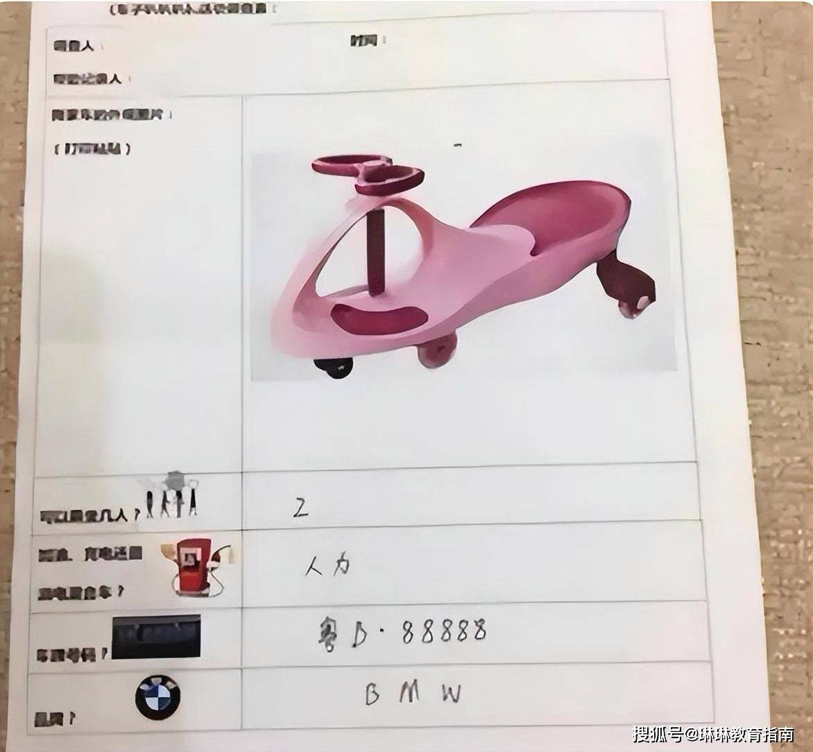 这样直白地摸家底,就算是脾气再好的家长也忍不下去了,更别说暴脾气的90后家长,既然幼儿园老师不仁,就别怪家长不义了,有家长直接甩出一张玩具车的照片,贴在了“私家车”那栏的问卷里。