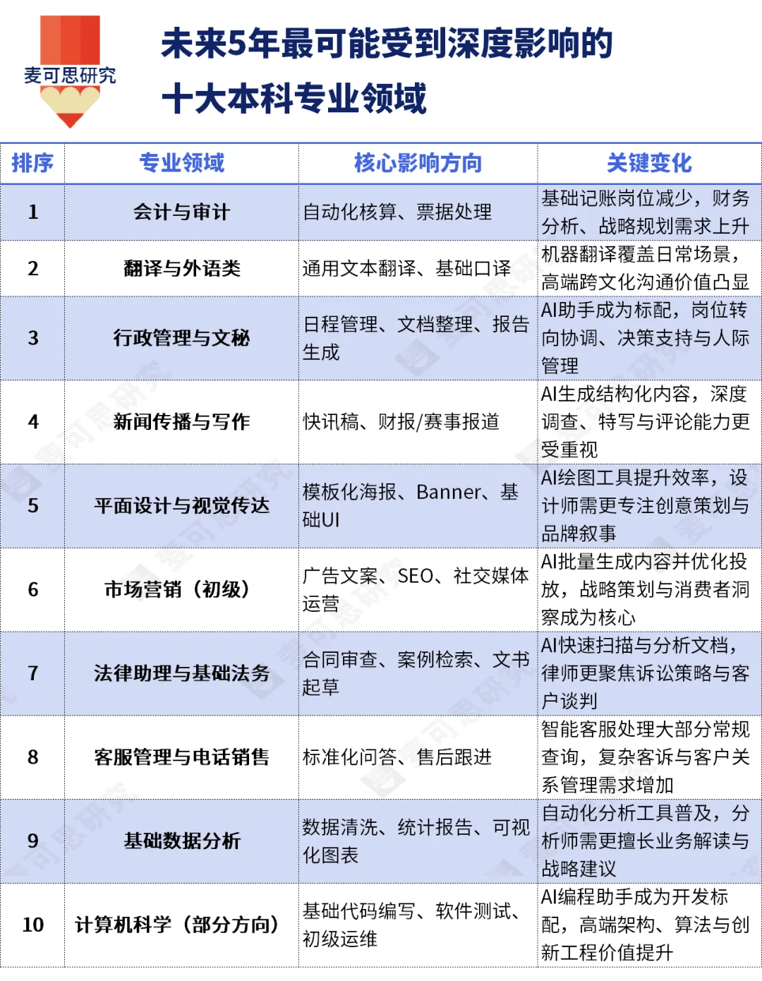 DeepSeek预测了未来5年最可能受到深度影响的十大本科专业领域,具体如下——